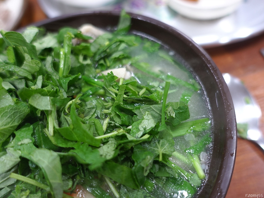 돼지국밥 나오는까지 시간이 조금 필요했습니다. 그렇게 나온 국밥. 우리가 익히 아는 돼지국밥과 모양새가 좀 다릅니다. 일단 국물이 맑습니다. 그리고 국밥 위에 뭔가가 수북이 올려져 있습니다. 방아잎입니다. 방아잎은 달라고해야만 넣어준답니다. 방아향이 살살 올라오는 것이 좋습니다. 방아 잘 모르시면 쌀국수 먹을 때 고수 생각하시면 됩니다. 방아잎 아래 김치가 담겨 있습니다.