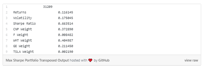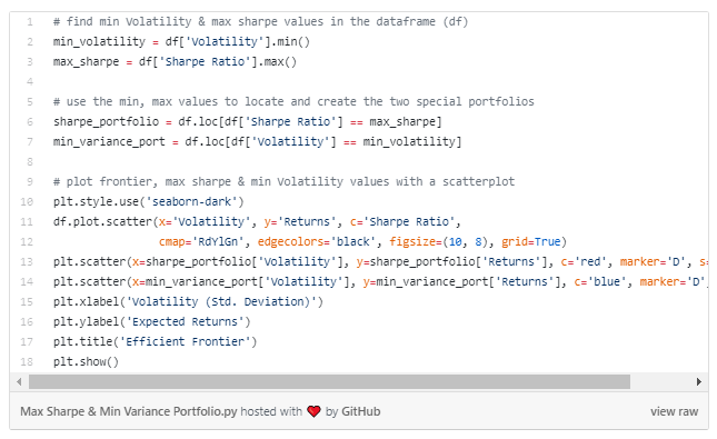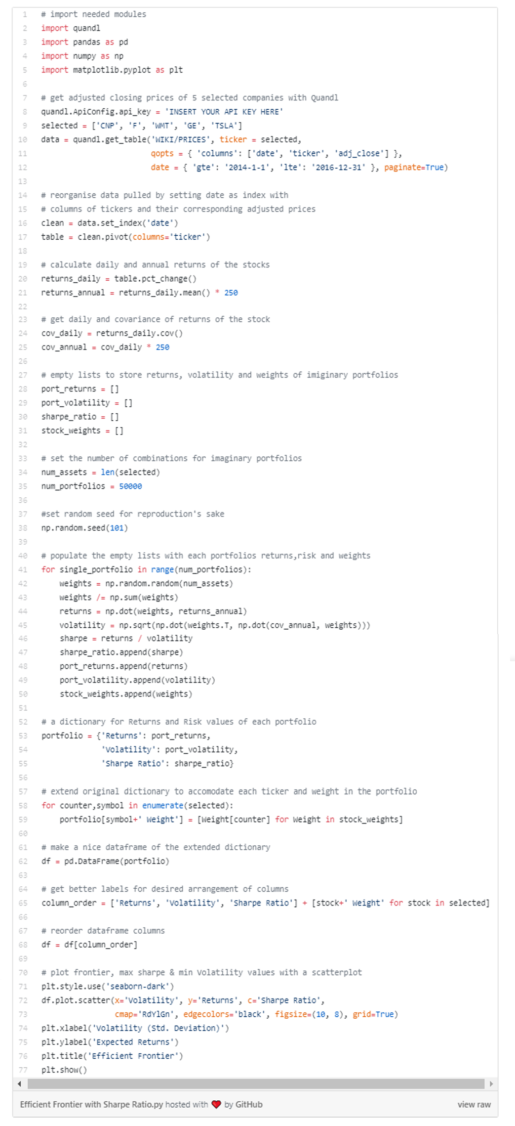 이 비율(Sharpe ratio)은 투자자산의 수익을 조정합니다. 그리고 이것은 리스크를 조합하는 것을 기준으로 하여, 투자자산을 구성하였을 때 각각에 대해 비교하는 것을 가능하게 합니다. 비교의 기준 없이, 다른 조합으로 발생하는 구성한 투자자산에 대해 예상되는 리스크와 수익을 비교하는 것은 거의 불가능합니다. (역자 주: 코드를 살펴보면 포트폴리오 구성 종목에 대해 각각의 비중을 다르게 해가며 변동성을 기반으로 기대수익률을 비교합니다.)