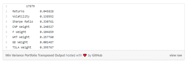 대부분의 리스크를 싫어하는 투자자들은 최소 변동성을 가지는 포트폴리오를 구성할 것이며 그에 대한 기대 수익률은 4.58%이며, 그때의 예상되는 변동성은 13.86%입니다. 리스크가 보정된 최대 수익률을 원하는 투자자는 샤프 비율(Sharpe Ratio)이 최대 값을 가질 때의 포트폴리오를 구성할 것이며 그때의 기대 수익률은 11.61%이고 예상되는 변동성은 17.50%입니다.