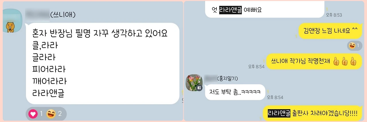 단톡방에 농담처럼 주고받던 라라앤글이 작가님들의 5년 후 일상에 등장했다.