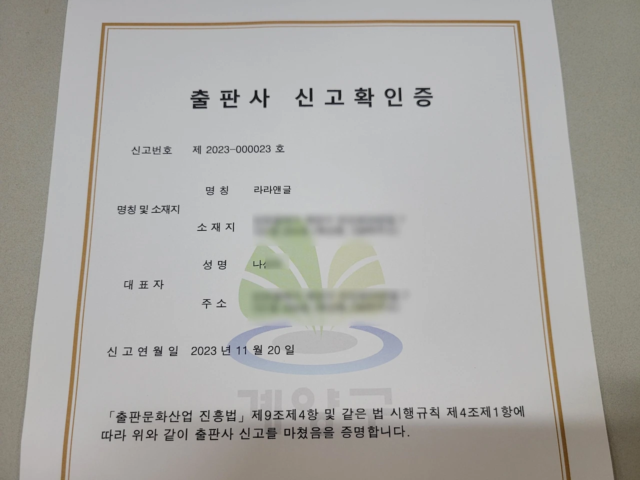 11월 21일 화요일 밤. 일일이 가위질을 해서 책갈피를 준비하고, 11월 22일 수요일 아침 출근 전 구청에 들러 출판사 면허세를 납부하고 드디어 출판사 신고확인증을 손에 쥐었다.