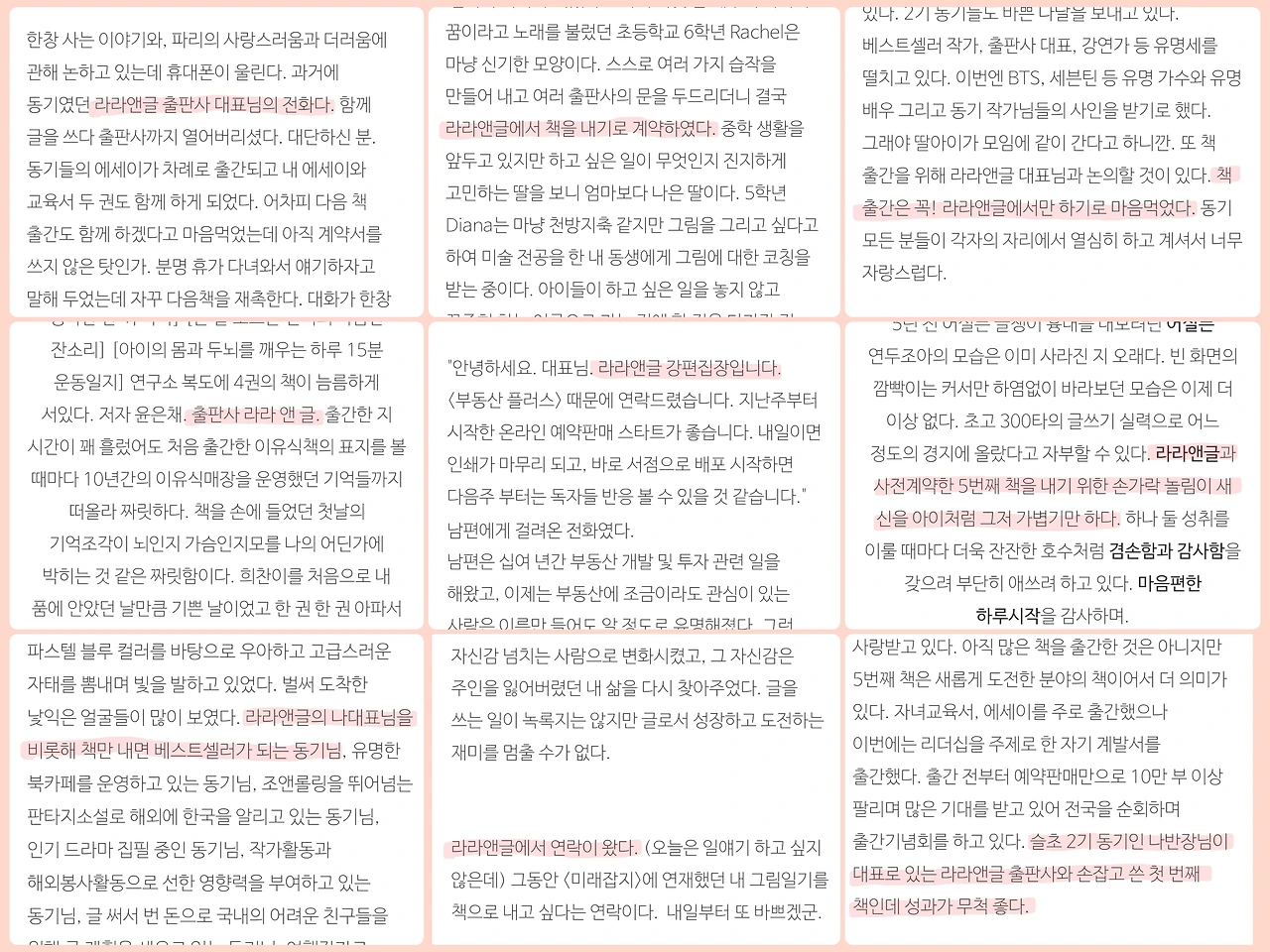 그렇게 우리의 단톡방에서는 심심치 않게 라라앤글 출판사가 등장했고 재미있는 이야깃거리가 되었다. 생각지도 못했는데 작가님들에 의해 라라앤글 출판사의 대표가 되었다.