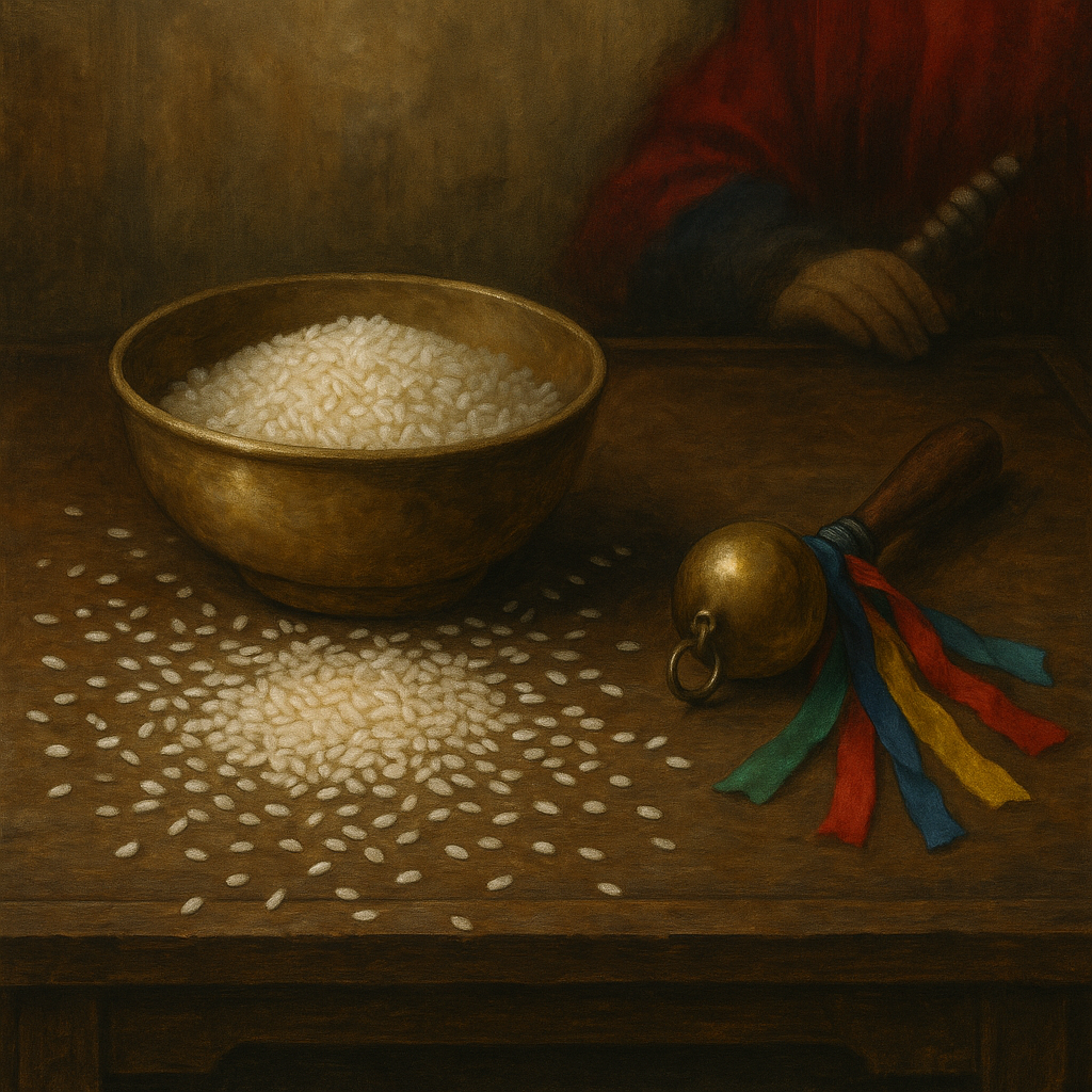 모든 것을 꿰고 있는 듯한 무당은 곧 타령 같기도 주문 같기도 한 말을 중얼거렸다. 시어머니는 그 말을 듣고 눈이 휘둥그레져 얼른 뛰어 들어갔다. 엎드려 절하고 비나이다 손을 비비며 기도드렸다. 한참 방울을 흔들던 무당이 쌀을 한 줌 움켜쥐더니 상 위로 뿌렸다.