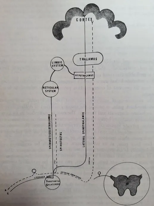 말단에서 발생된 통증 유발 자극이 대뇌로 전달되는 경로 [그림 출처 = low back pain syndrome]