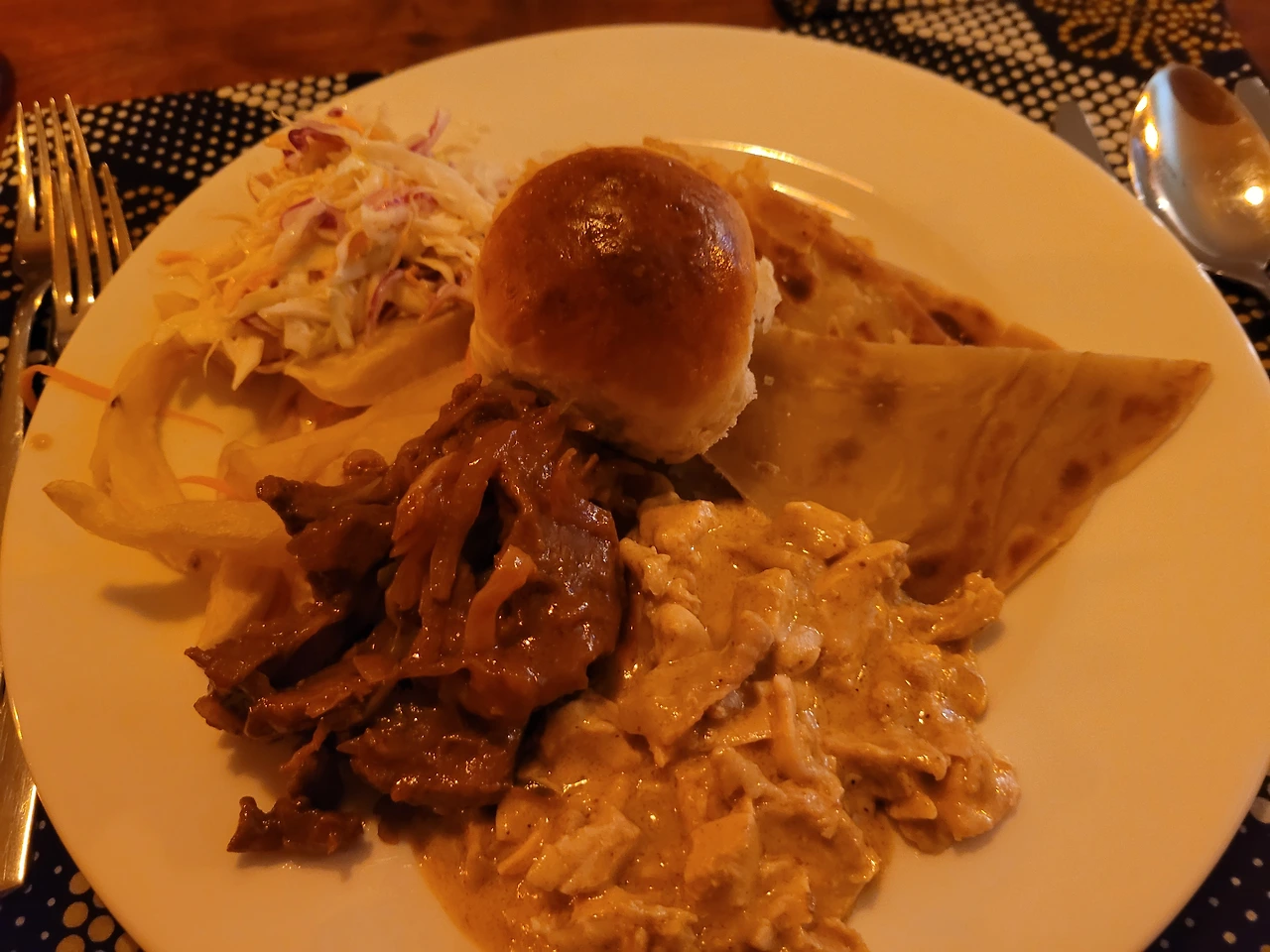 해가 지니 배가 고팠다. 따로 간식이 없어서 사파리 기간 중 식사시간은 우리에게는 가장 중요한 순간이다. 오늘도 맛있게 나온 저녁을 잔뜩 떠먹었다. 오늘은 맥주도 한 병씩 시켜서 먹으면서 천천히 저녁을 즐겼다. 하나둘 다른 사람들이 방으로 들어가는 것을 보며 오늘 하루를 마무리하는 이야기를 하고 있을 때, 노랫소리가 들렸다.