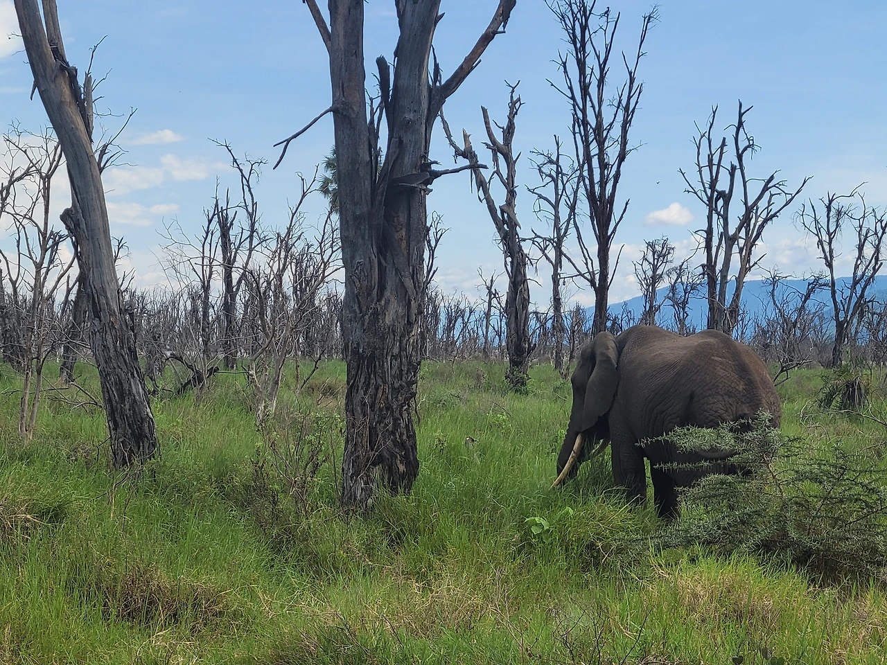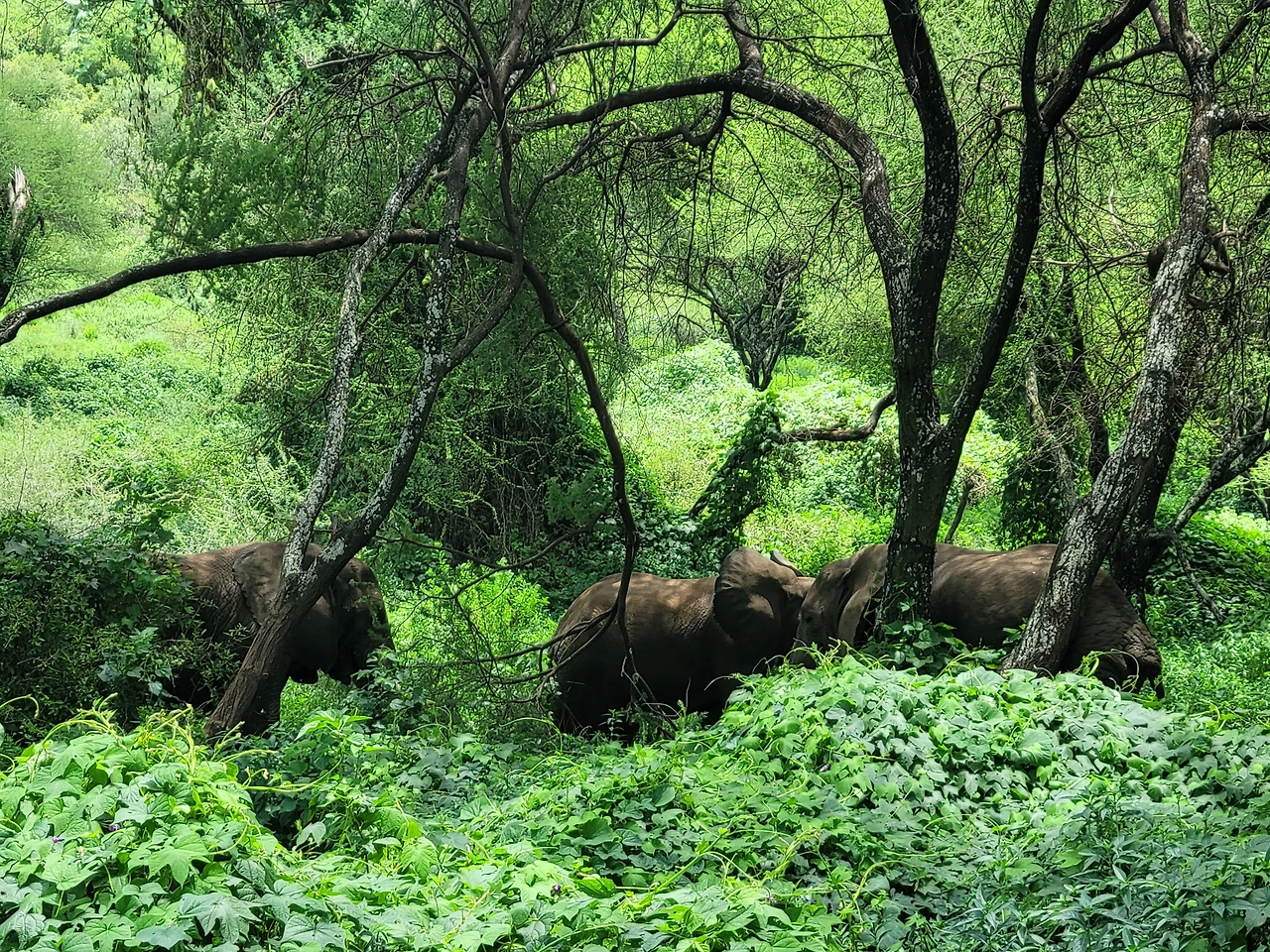 시원한 바람이 산들산들 불고 적당한 그늘까지 완벽했다. 점심시간 전쯤 코끼리 한 무리가 우리 차 앞을 지나갔다. 시동을 끄고 아기 코끼리부터 지나가는 관경을 보고 있었는데, 갑자기 엄청난 코끼리 울음소리가 우리 옆에서 들렸다. 옆을 봤을 때는 엄마 코끼리가 정말 화가 났다는 표정으로 우리를 쳐다봤다. 그 순간 아미르가 시동을 걸고 빠른 속도로 출발했다. 조금만 늦었으면 그 코끼리는 우리를 공격했을 수도 있었다.