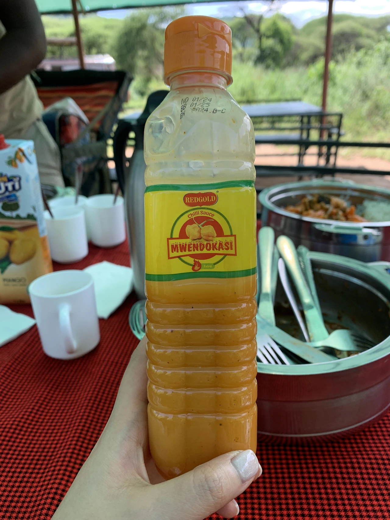 갑작스러운 짜릿한 이벤트가 끝나고 점심시간이 되었다. 점심은 어제와 똑같이 뷔페식! 어제와 다르게 뿌려먹는 칠리소스가 있었다. Arusha에 있는 마트에서 살 수 있다는 칠리소스인데, 이거 맛있다. 맵고 짠 수준이 적절해서 곁들여 먹기 딱 좋았다. 이 소스로 인해 맛다시는 또 필요가 없었다.