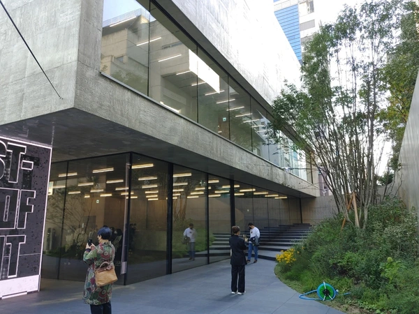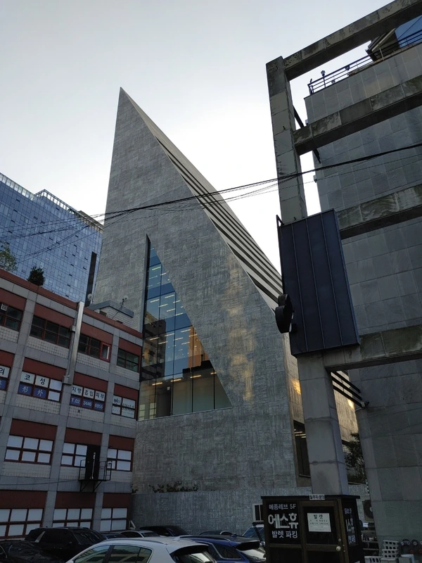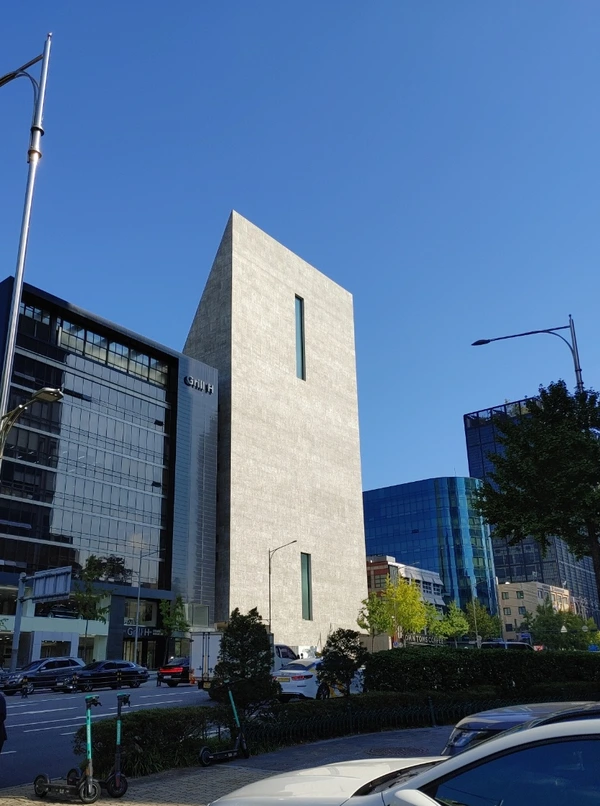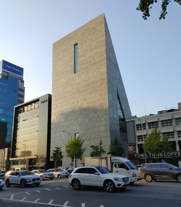확실히 존재감은 엄청나다. 멀리서부터 이 건물이 확실히 인지되는데, 미니멀하면서도 단순한 형태가 워낙에 강력하기 때문이다. 군더더기가 전혀 없고 주변 건물들을 전부 배경으로 만들어버린다는 느낌이 든다. 주변에 장윤규 등이 작업한 만만치 않은 건물들이 있는데, 그것들이 전부 조잡하게(!) 느껴진다. 헤르조그 드 뮈론(이하 헤르조그)이 무엇을 의도한 것인지는 확실히 알겠다. 도산대로에 좋은 건물이 없으니, 우리가 기념비 하나 확실히 만들겠다는 강력한 의지다. 하지만 그것이 지나치다고 느낄 사람도 분명히 존재하리라고 생각한다. 좀 심하게 말하자면 도산대로에 세모꼴 '비석'을 '빡!!'하고 심어놓은 느낌이기 때문이다. 다소 성의없다고 느껴질 수 있는 부분이다. 섬세하고 세밀한 접근은 아니었다고 생각한다. 알바 하나 시켜서 쉽게 스터디해보고 결정해버린 느낌? 존재감 하나는 정말 강력하지만, 그것 하나를 위해서 희생한 것들도 정말 많다. 그것은 내부를 살펴보면서 확실히 알게 되었다.