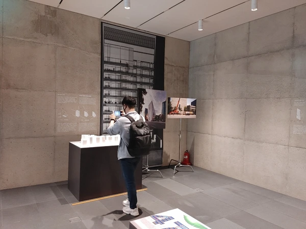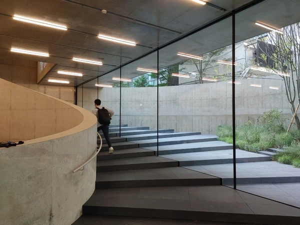 지금 송은문화재단 사옥을 가면 1층과 2층, 3층에 걸쳐 건물 디자인과 미술작품 전시를 보고 지하 2층으로 이동해서 영상전시를 보는 프로그램으로 운영되고 있다. 시간당 예약할 수 있는 인원이 한정되어 있기 때문에 참고하셔서 방문하시면 좋을 듯 하다(네이버로 예약). 1층 로비로 들어서면 검은 석재 바닥이 외부공간까지 연장되어 있고, 지하까지 뚫린 보이드 공간을 둘러싸고 계단이 상부로 이어진다. 이 석재 바닥마감도 자주 보던 실리콘 코킹이 아닌 오픈조인트로 마감되어 있어 깔끔한 느낌이 든다. 1층에서 주목할 부분은 건물 후면부에 기둥이 전혀 없다는 것이다. 그 큰 메스가 유리 위에 그냥 떠있다. 열린 공간을 만들기 위해 기둥을 없애고 전면부 코어에서 켄틸레버로 잡아 뺀 것 같은데, 구조적으로 보강을 어떻게 했는지는 몰라도 상당히 무리를 한 것은 분명해보인다. 그래서 그런지 건물 높이에 비해서는 내부공간이 조금 좁다고 느껴진다.