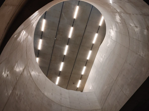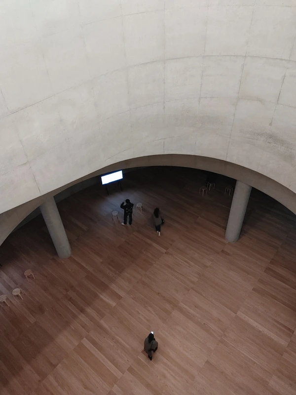 헤르조그의 주요 작품 모형과 사진작업을 보고 3층의 미술 작품들을 관람하고 나면 지하 2층의 영상 전시를 보게 된다. 여기에서 많은 사람들이 SNS에 사진을 올리고 있는 거대한 원형 보이드 공간을 볼 수 있다. 역시나 멋진 공간이다. 벽체의 두께나 면처리 퀄리티 등을 볼 때 시공할 때 많은 어려움이 있었을 것이라고 생각된다. 이 공간도 굳이 비판을 하자고 하면 전체 건물 형상과의 연관성이 부족하고 멋진 공간을 만들고야 말겠다는 다소 작위적인 시도처럼 보이기는 한다. 이런 형상의 보이드 공간이 이 건물이 어울리는지, 여기에 꼭 있어야 하는지 약간의 의심이 든다.