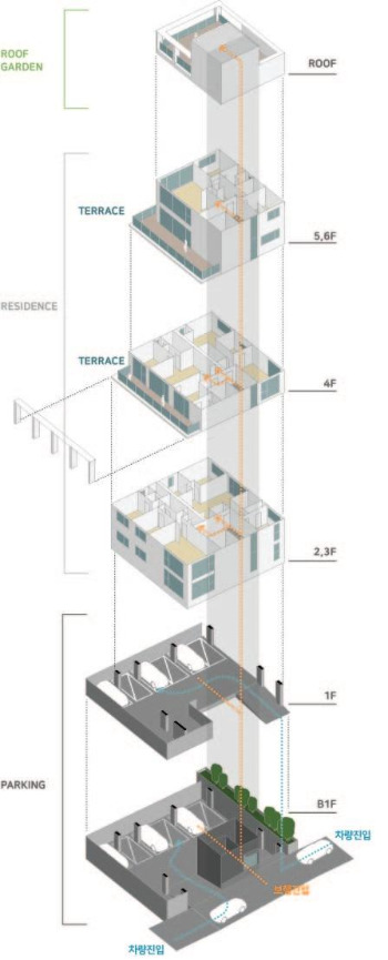 세대와 주차장이 적층된 개념과 동선을 보여주려고 하였습니다.