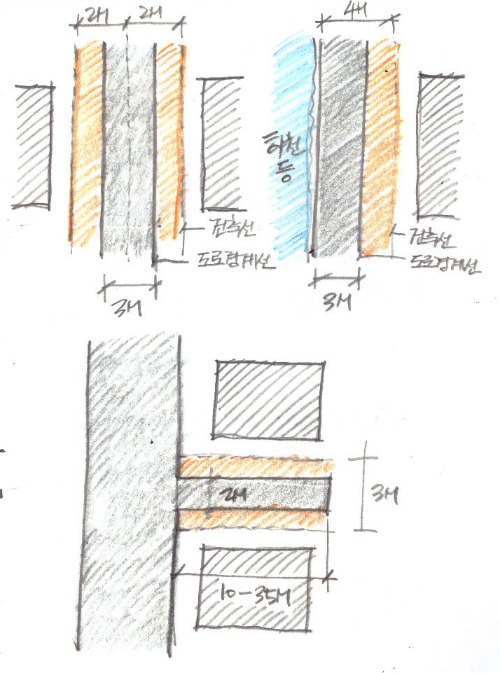 또 하나, 땅을 보실 때 잘 살피셔야 할 것이 도로 폭 확보입니다. 도심지의 좁은 골목은 3미터도 채 안되는 경우가 있습니다. 건축법에서는 이러한 도로를 완전한 도로로 인정하지 않습니다. 내 땅을 도로에 내주더라도 무조건 도로폭 4미터를 확보하라고 하는데요. 이 때 도로 건너편에도 필지가 있다면 도로 중심선에서 각각의 필지로 2미터씩 물러서 도로선을 다시 설정하고, 거기서부터 건물을 지을 수 있도록 하고 있습니다. 당연히 이것이 공평하겠죠. 만약 도로 건너편이 하천이나 절벽 등 건물을 지을 수 없는 곳이라면 우리 땅으로만 물러서 4미터 폭을 확보해야만 합니다.