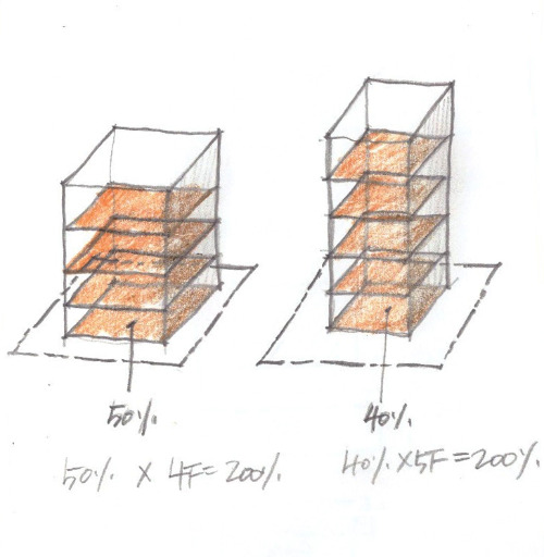 만약에 건폐율이 50%, 용적률 200%인 땅이 있다고 해보겠습니다. 그럼 전체 땅의 절반 정도에만 건물을 지을 수 있겠죠. 이 건폐율을 전부 활용한다고 하면 50% x 4F = 200% 이므로 4개층만 지을 수 있습니다. 하지만 건폐율을 좀 더 여유롭게 활용하여 40% 만 쓴다면