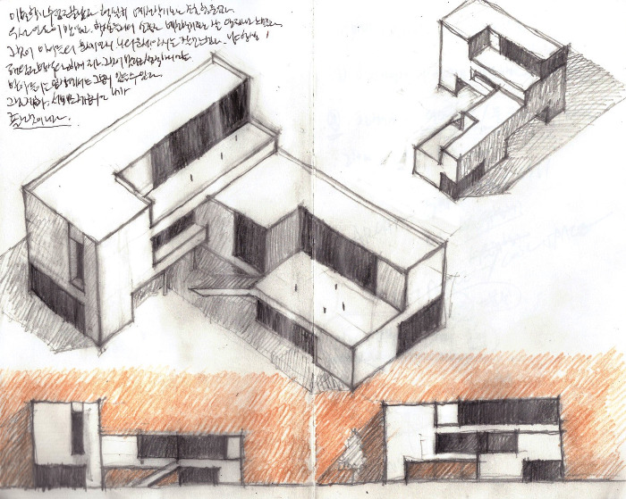 길쭉한 메스 두 개가 ㄱ자로 이어지는데, 그 사이를 테라스가 완충하는 식으로 되어 있다.