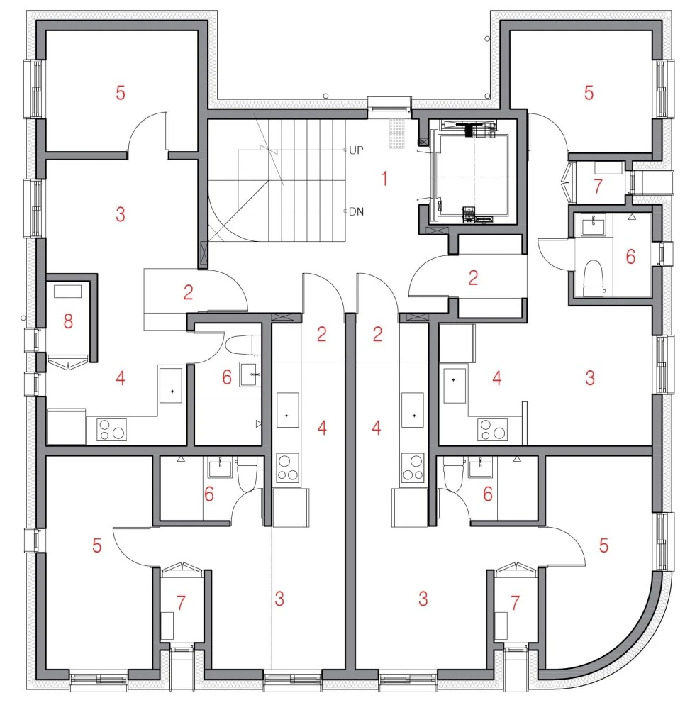 아래는 이런 코어 형식이 적용된 봄 건축연구소의 의왕시 다가구주택 사례입니다.