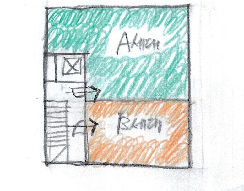 서측에 코어를 둔다면 (만약 서향 집을 감수한다면 동측코어도 좌우 대칭으로 같은 경우입니다) 주거를 위 아래로 둘 수 밖에 없습니다. 한쪽 집이 북향이 되니 아래쪽 집보다 상대적으로 불리합니다. 하지만 1번 대안보다 주거의 형태가 네모반듯하여 평면을 짜기에 좋습니다. 상대적으로 좀 더 평면이 잘 짜여질 가능성이 높습니다.