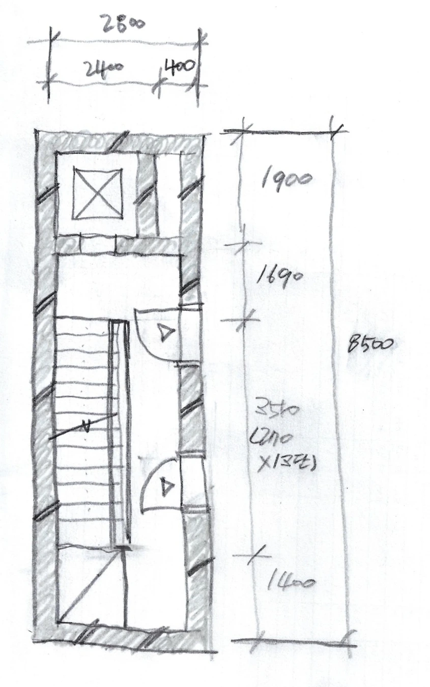 이것이 몇 개의 변형이 가능합니다. 위의 구성이 면적의 손해가 가장 적긴 하지만, 각 세대로 들어가는 문이 엘리베이터 홀의 작은 홀에서 모두 접근 가능해야 한다는 단점이 있죠. 그러면 각 층 평면 구성이 무척 힘들어지는 단점이 있습니다. 코어는 가장 콤팩트하게 풀었는데, 각 층의 복도가 길게 나서 효율이 떨어질 수 있죠. 그래서 계단을 일자로 한번에 올라가도록 길게 빼고, 계단 측면에 복도를 붙이는 형식의 코어 구성도 자주 사용됩니다. 아래와 같은 구성입니다. 약 2.8미터 X 8.5 미터의 크기입니다. 이것을 B타입 코어라고 하겠습니다.