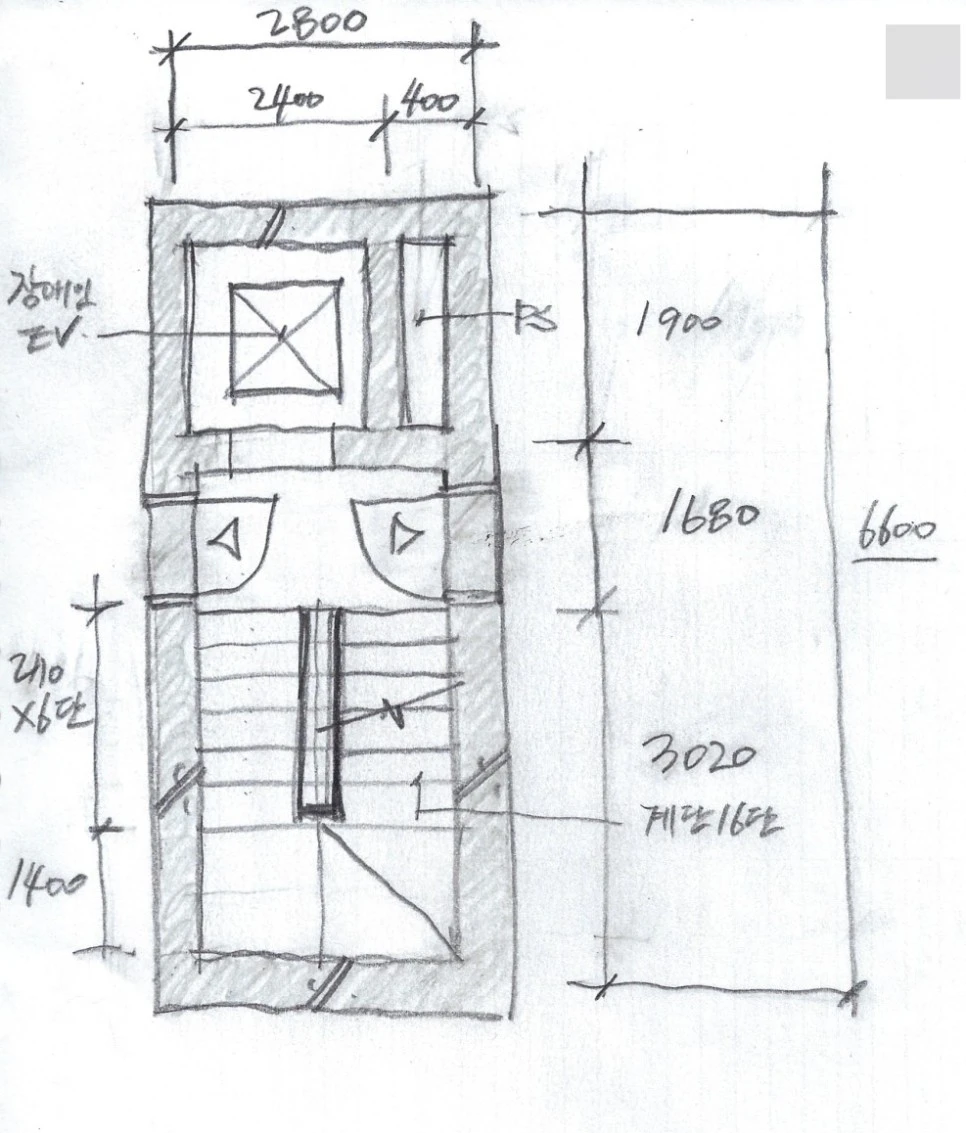 계단 법규에 의해 계단의 폭, 난간 등을 제외한 순수 내경이 1.2미터 이상 나와야 합니다. 이 계단이 오르락 내리락하여 두개 붙는다고 하면 순수 내경이 2.4미터이고, 기타 난간, 최소한의 미장마감, 콘크리트 골조 벽 등이 붙는다고 가정하면 골조 중심선을 기준으로 최소한 2.8미터가 필요합니다. 그리고 3미터 이하일 경우 계단 참이 필요하진 않지만, 사용상 편의를 위해 계단참 1개를 놓는다고 가정하겠습니다. 이렇게 구성된 계단에 아까 산정한 엘리베이터를 붙이면 최소한 아래 그림과 같은 코어 구성이 필요하다는 결ㅇ 론입니다. 이 때 장애인 엘리베이터 전면에 1.4미터 X 1.4 미터의 휠체어 활동공간이 필요하다는 것을 고려해야 합니다. 제가 볼 때 이것이 상가주택 평면을 구성할 때 가장 콤팩트하고 기본적이라고 할 만한 코어 평면 구성입니다. 약 2.8미터 X 6.6 미터의 크기입니다. 이것을 A타입 코어라고 하겠습니다.