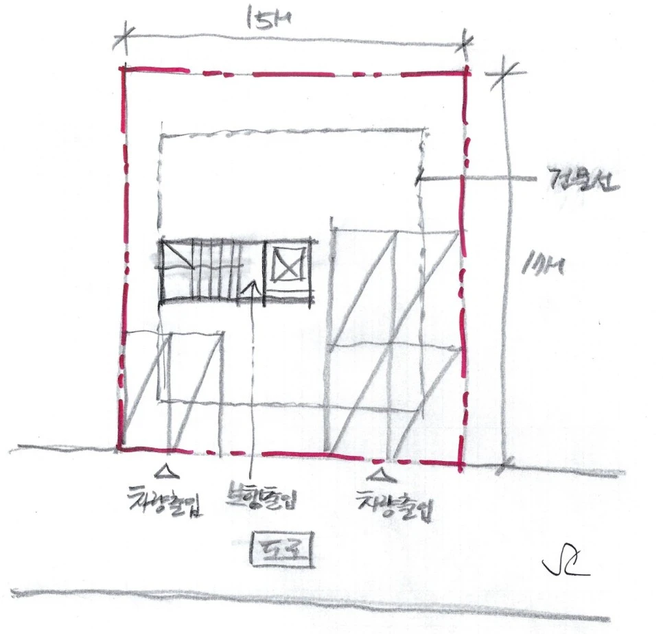 사실 향과 도로가 접하는 상황, 주변 건물 및 필지 상황은 경우에 따라 천차만별이고 그에 따라 검토과정도 여러가지 방향으로 나뉩니다. 이 글에서는 그 과정을 간략히 소개해드리기 위해 위의 경우로 단순화시켜 설명드리겠습니다.