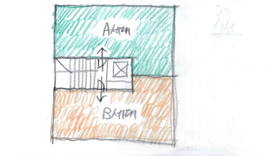 먼저 설명드렸듯이, 코어를 가로로 길게 두면 북쪽과 남쪽에 두는 것이 어렵습니다. 그러니 남은 대안은 가운데입니다. 가운데 두면 건물을 위 아래로 갈라서 대칭으로 만들 수 있습니다. 그러면 위 아래 주거 세대가 면적을 포함해서 동일한 환경으로 만들 수 있습니다. 다만 북측 세대가 전체 북향이 되어 채광 조건이 많이 나빠집니다. 이런 점은 단점이라고 할 수 있습니다. 현재 건물 전체 모양이 가로보다는 세로가 긴 형상이라 위아래로 분절하면 첫번째 대안보다는 주거 세대가 덜 길쭉해집니다. 상대적으로 평면 구성이 쉽다고 할 수 있겠습니다. 복도 공간 역시 최소화되어 면적 효율성도 높다고 볼 수 있습니다.
