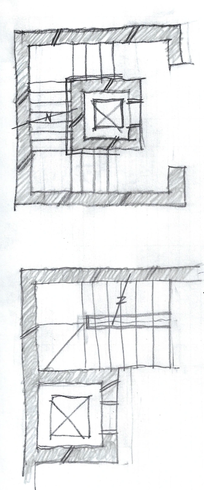마지막으로 아래와 같이 코어를 계단으로 감싸거나, 계단 측면에 엘리베이터를 붙이는 아래와 같은 구성도 가끔 쓰입니다. 하지만 코어에 부속된 복도나 계단 참 등에 면적이 많이 할당되어 비효율적으로 생각될 수 있죠. 그래서 아주 자주 쓰이는 구성은 아닙니다. 하지만 평면 구성에 따라 이런 코어 형식이 쓰일 수 있기 때문에 한번쯤 봐두셔도 좋을 듯 합니다.