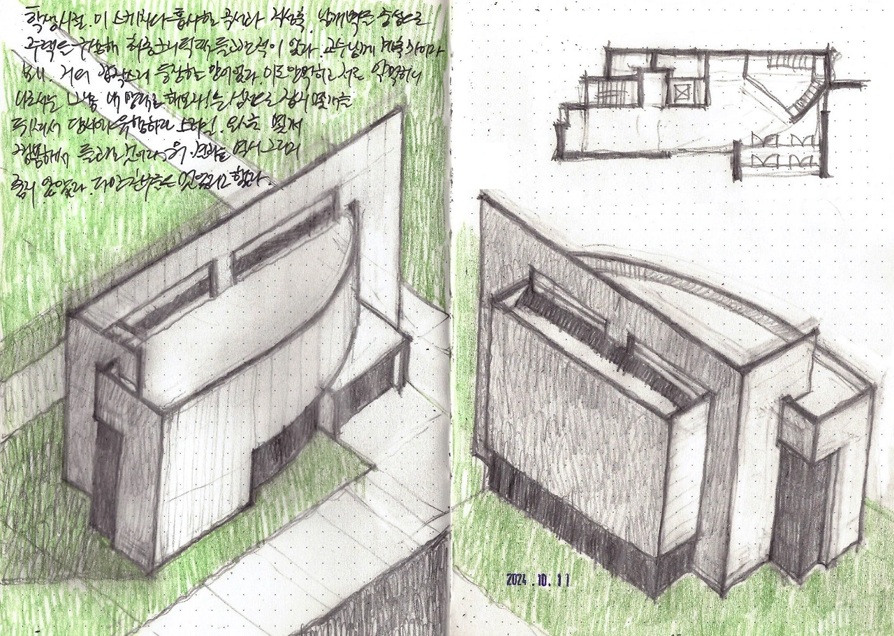 학창시절, 이 스케치와 유사하게 타원형 곡선과 축을 이용한 주택 설계를 해서 마감모형을 제출한 적이 있었다. 뭘 해가도 매 시간 교수님께 까이기만(비속어인건 알지만 대체할 말을 도저히 못찾겠다)하니 답답해서 잡지를 뒤져서 당시에 유행하거나 내 맘에 드는 요소들을 적절히 조합해서 들고 간 것이다. 교수님의 반응은 당연히 안좋았던 것 같다. 자기 말을 무시하고 내맘대로 해가서 그랬던 것 같다. 주변 친구들은 멋있다는 식의 말을 해줬던 것 같다.