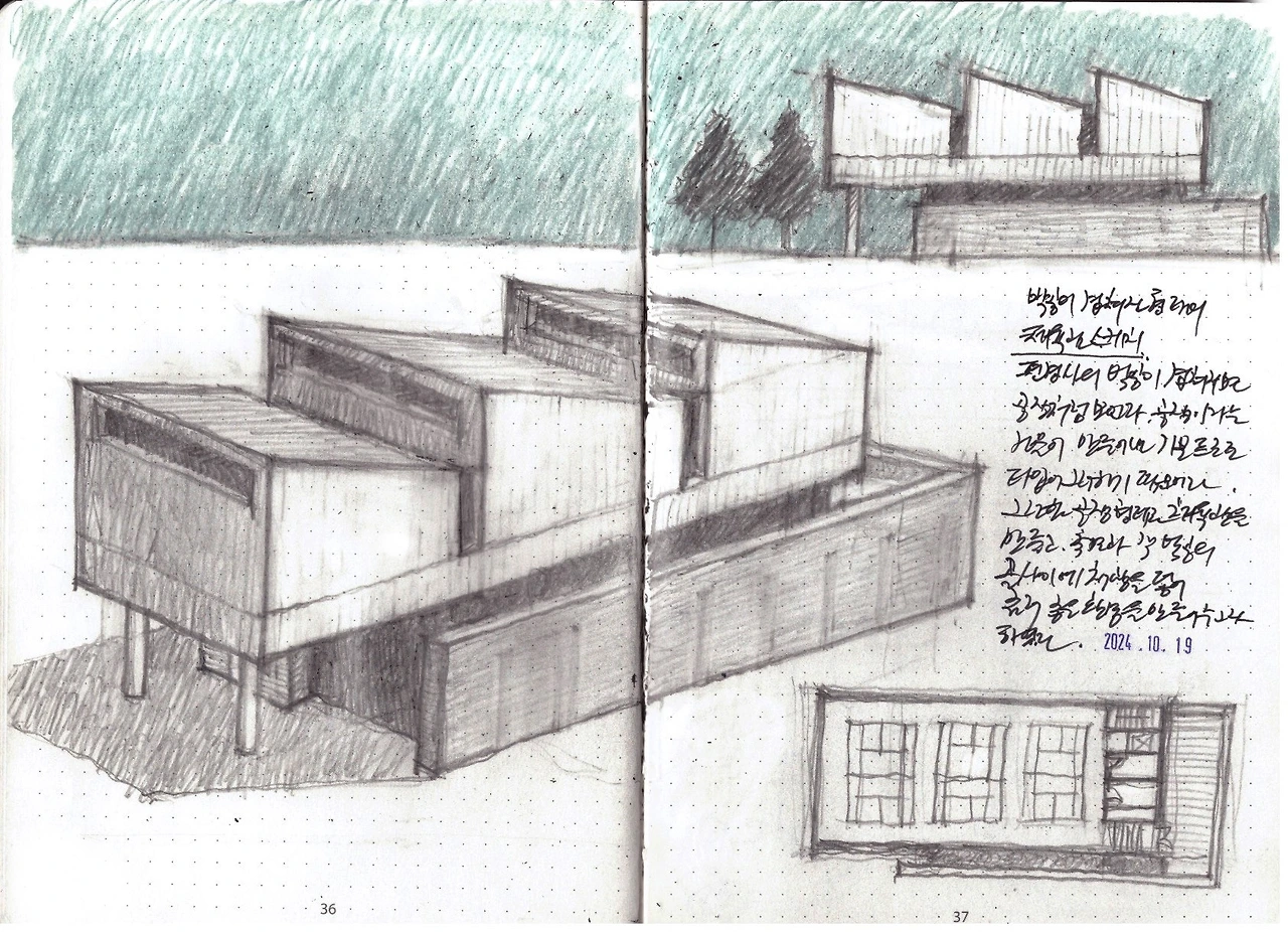 그런 모양으로 체육관을 지으면 어떨까 해서 스케치한 것이다. 상, 하단부를 구분하여 상단부는 밝게, 하단부는 어둡게 하고 상단부는 클리어한 유리 위에 띄워 부유하는 느낌을 내려고 했다. 박공이 꺾이는 부분에 세로로 긴 창과 천창을 넣어서 실내 채광에 유리하도록 하였다.