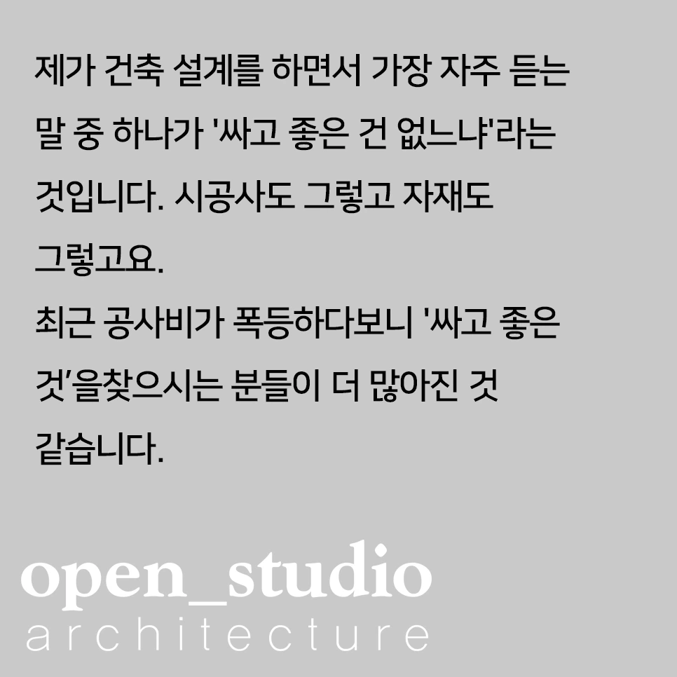 제가 건축 설계를 하면서 가장 자주 듣는 말 중 하나가 '싸고 좋은 건 없느냐'라는 말입니다. 시공사도 그렇고 자재도 그렇고요.