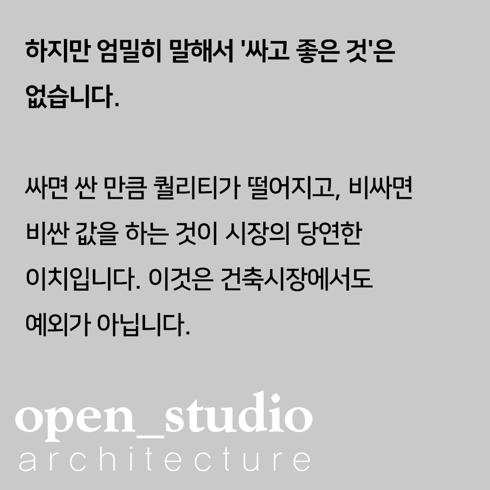 하지만 엄밀히 말해서 '싸고 좋은 것'은 없습니다. 싸면 싼 만큼 퀄리티가 떨어지고, 비싸면 비싼 값을 하는 것이 시장의 당연한 이치입니다. 이것은 건축시장에서도 예외가 아닙니다.
