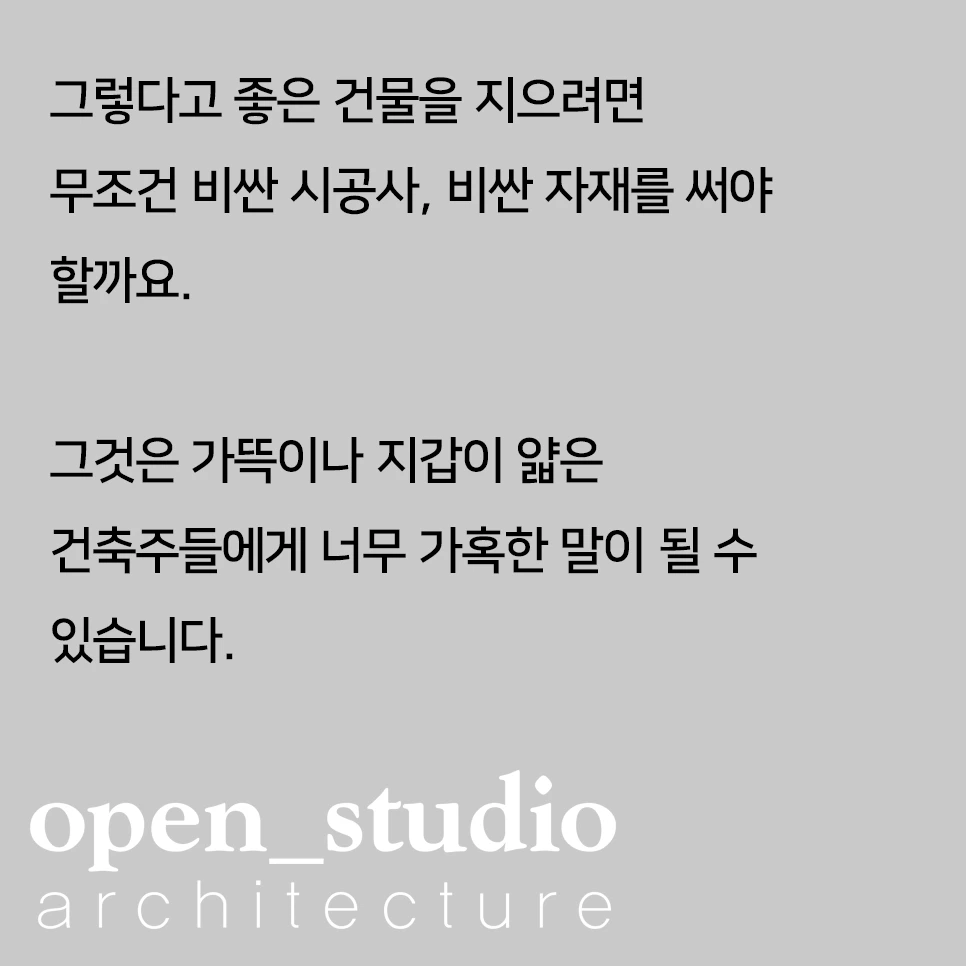 그렇다고 좋은 건물을 지으려면 무조건 비싼 시공사, 비싼 자재를 써야 할까요. 그것은 가뜩이나 지갑이 얇은 건축주들에게 너무 가혹한 말이 될 수 있습니다.