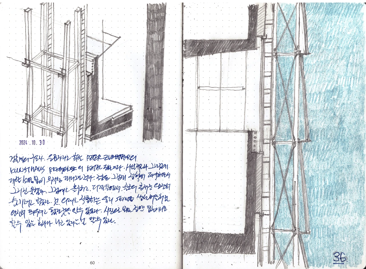 건축계의 운둔자 내지는 성자라는 피터 줌터의 Kunsthaus Bregenz의 외부 디테일이다. 인터넷에서 받은 이미지를 보고 그린 것인데, 재료명이 무엇인지 알 수 없어서 일단 이미지만 따라 그려봤다.