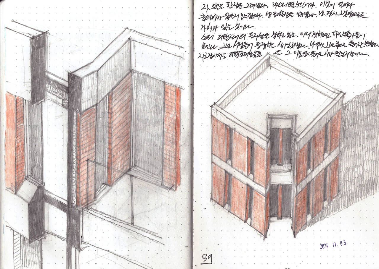 루이스 칸이나 마리오 보타 스타일의 벽돌과 노출콘크리크가 조합된 건물을 그려 보았다. 두 재료는 미관상 무척 잘 어울리는 재료이지만 만나는 부분에서의 단열이 문제가 된다. 노출콘은 외단열을 강제하는 재료지만 건물은 궁국적으로 외단열이 좋기 때문에 벽돌을 시공하면 보통 외단열을 하기 때문이다. 그러니 결론은 노출콘 부분에 단열을 포기하거나 전부 다 내단열로 가야 한다. 이 스케치는 첫번째를 적용한 것이다.