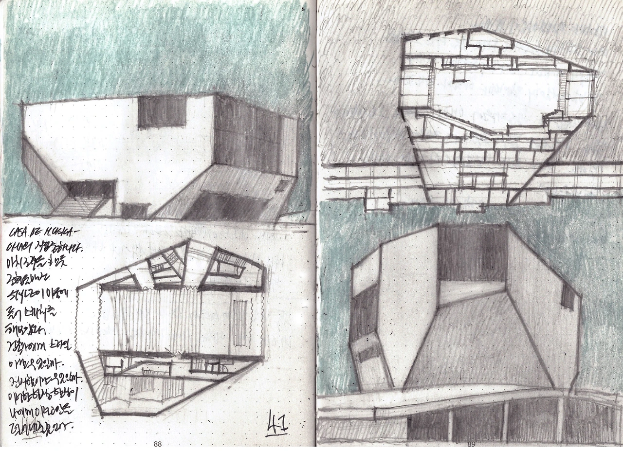 렘쿨하스의 까사 드 뮤지카를 그려보았다. 돌을 깎아놓은 듯한 특유의 조각적인 형태가 개인적으로는 참 매력적이라고 느꼈고, 굉장히 멋지다고 생각했다. 각 부분별로 돌출된 부분에 클리어한 유리를 넣고, 도시의 풍경을 배경으로 오케스트라 등이 연주하도록 공연장을 만든 것이 멋진 아이디어라고 생각했다.