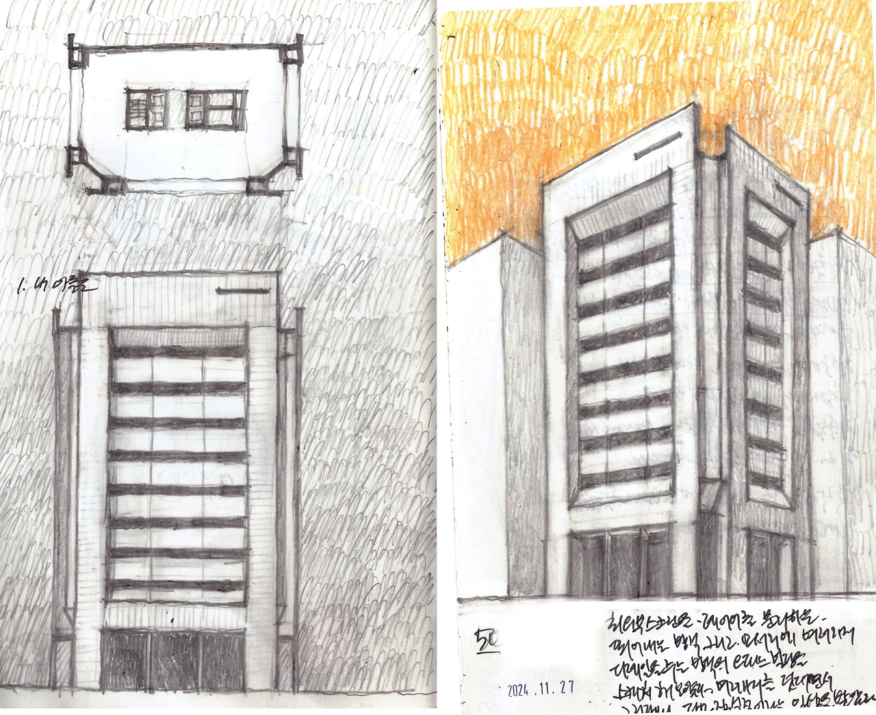최외부의 레이어를 떼어내면서 모서리를 강조한 스타일의 오피스 건물을 그려보았다. 실제 오피스는 내부 공간의 효율성을 중시하기 때문에, 공간적으로 단면적으로 뭔가 시도해볼만한 여지가 별로 없다. 내부적으로 보면 미스의 시그램 빌딩과 다들 크게 다를 게 없는 것이다. 그러니 새로운 어떤 시도를 한다면 외피 그리고 저층 공용부에 집중하게 된다. 나는 외피의 레이어를 떼어내면서 섬세한 디테일을 주고, 모서리 역시 뭔가 요소를 추가해보려고 했다.