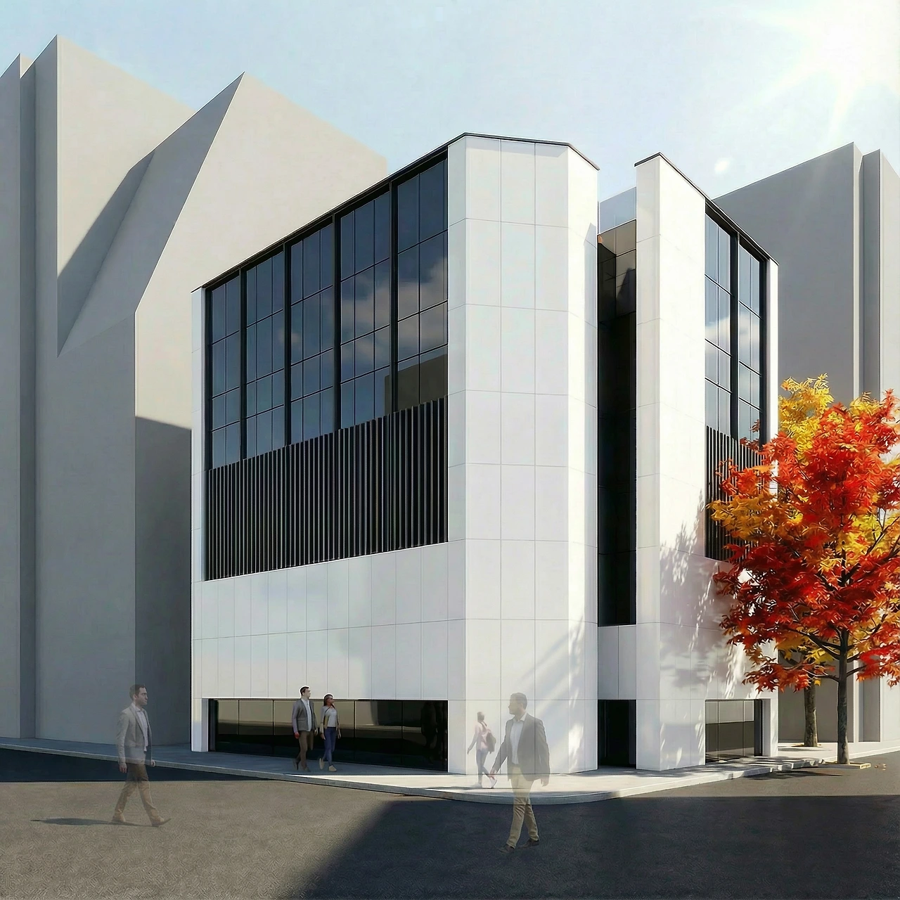 코너부의 사선부분을 단순하게 정리하면서 디자인 요소로 활용하고자 하였다. 외부 마감재는 하얀 계통의 패널 재료를 적용해서 기존의 칙칙한 이미지를 벗고 밝은 이미지를 만들고자 하였다. 전면부와 측면부는 넓은 부분에 커튼월을 적용해서 상업, 근생건물에 적합한 개방감을 부여했다.