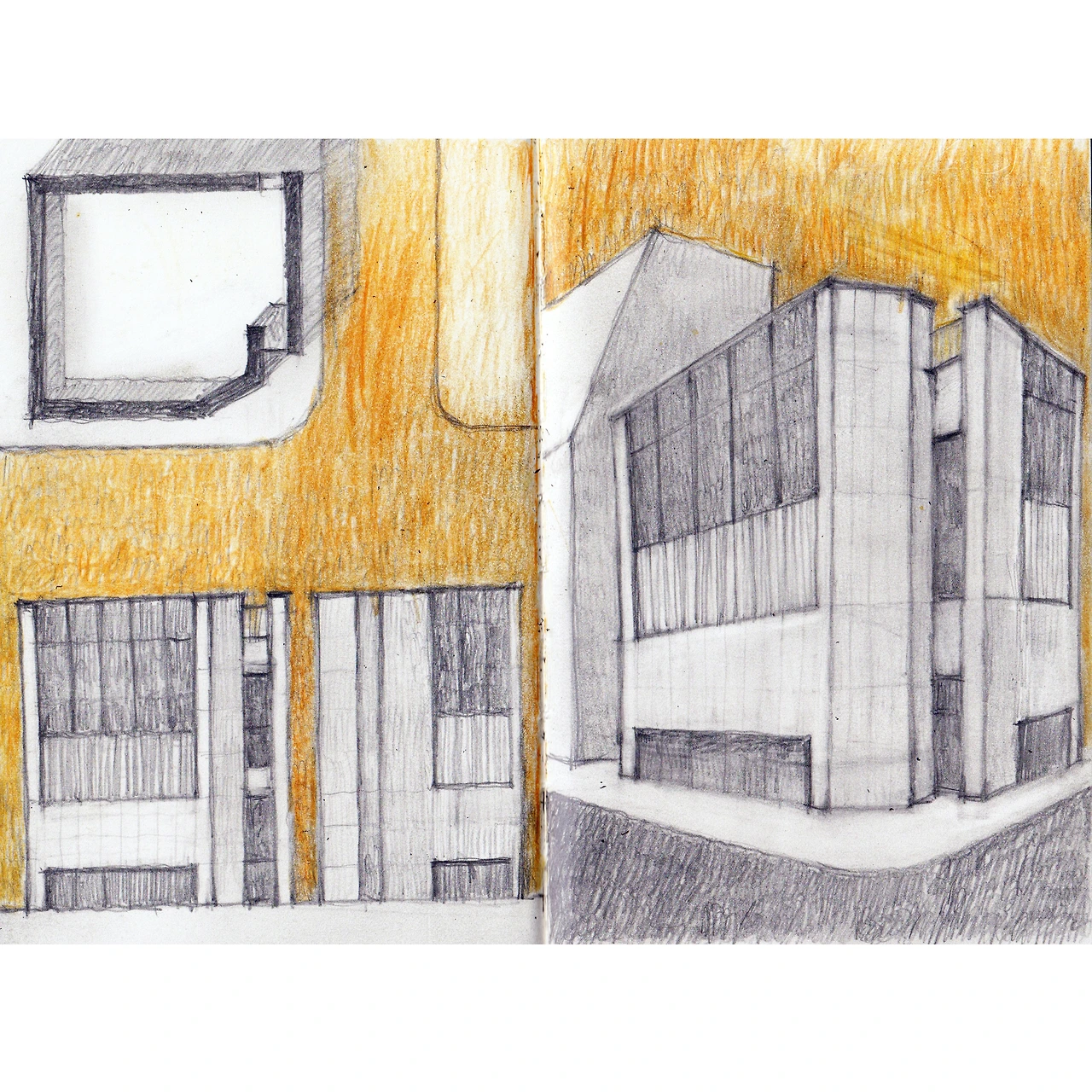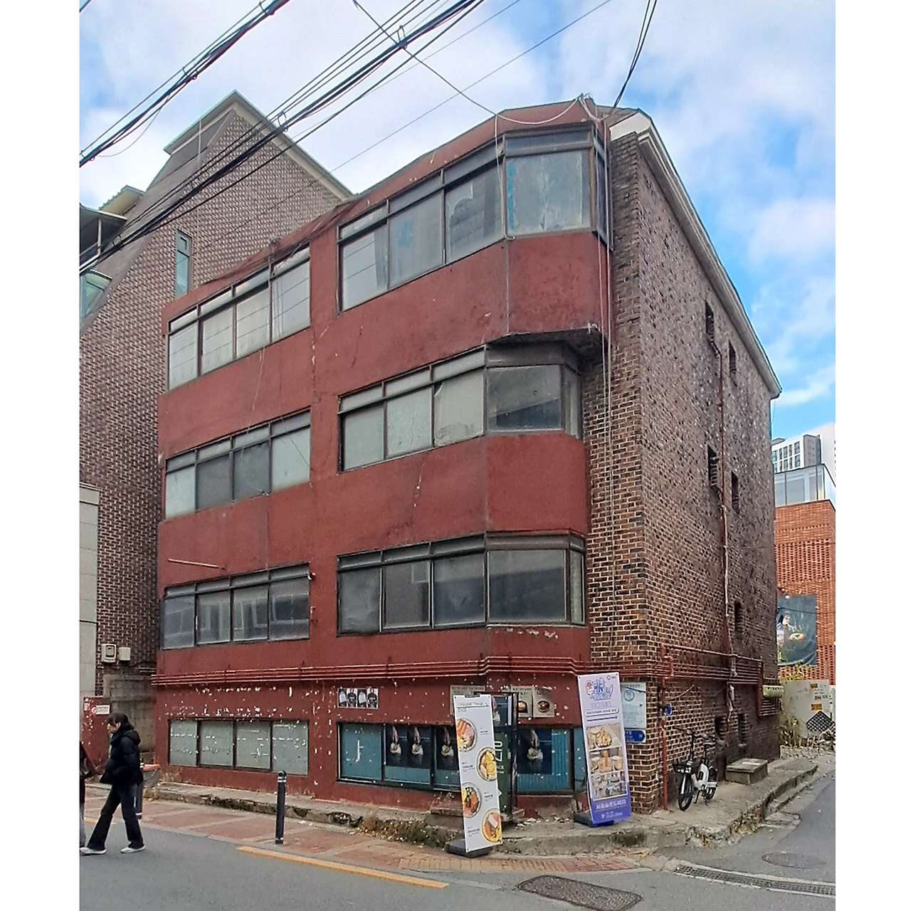 아틀리에 거리에서의 세 번째 스케치 제안이다. 이 건물은 아틀리에 거리에 있는 다가구 내지는 다세대로 보이는 주거건물이었다. 분절된 창호 패턴과 붉은 도장 마감이 상당히 칙칙하고 어두운 느낌을 주었다. 건물 자체가 요철이 거의 없어 활용할만한 디자인 요소가 별로 없었다.