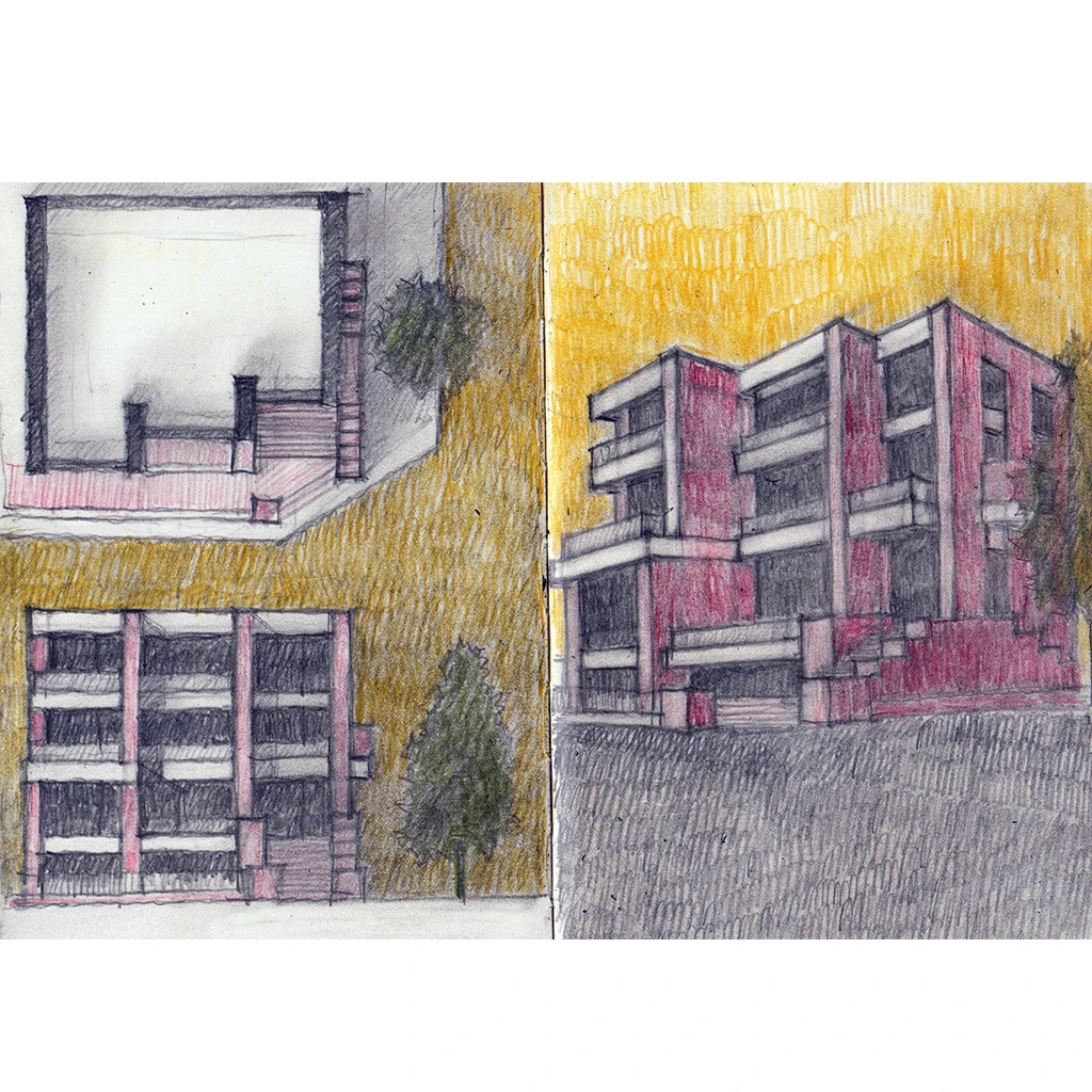 이 스케치 계획안 역시 아틀리에 거리에 있는 구옥을 바탕으로 그려본 것이다. 이미 어느 정도의 리모델링을 거쳐 피트니스 시설로 활용되고 있었다. 한 층을 증축하고, 기존 건물에 남아있는 레이어링된 공간의 느낌을 리모델링을 통해 더 살려보려고 했다. 세로로 나란히 늘어선 붉은 벽돌의 연속된 벽체와, 그것을 가로지르는 노출콘크리트의 슬라브 라인을 강조하려고 했다.
