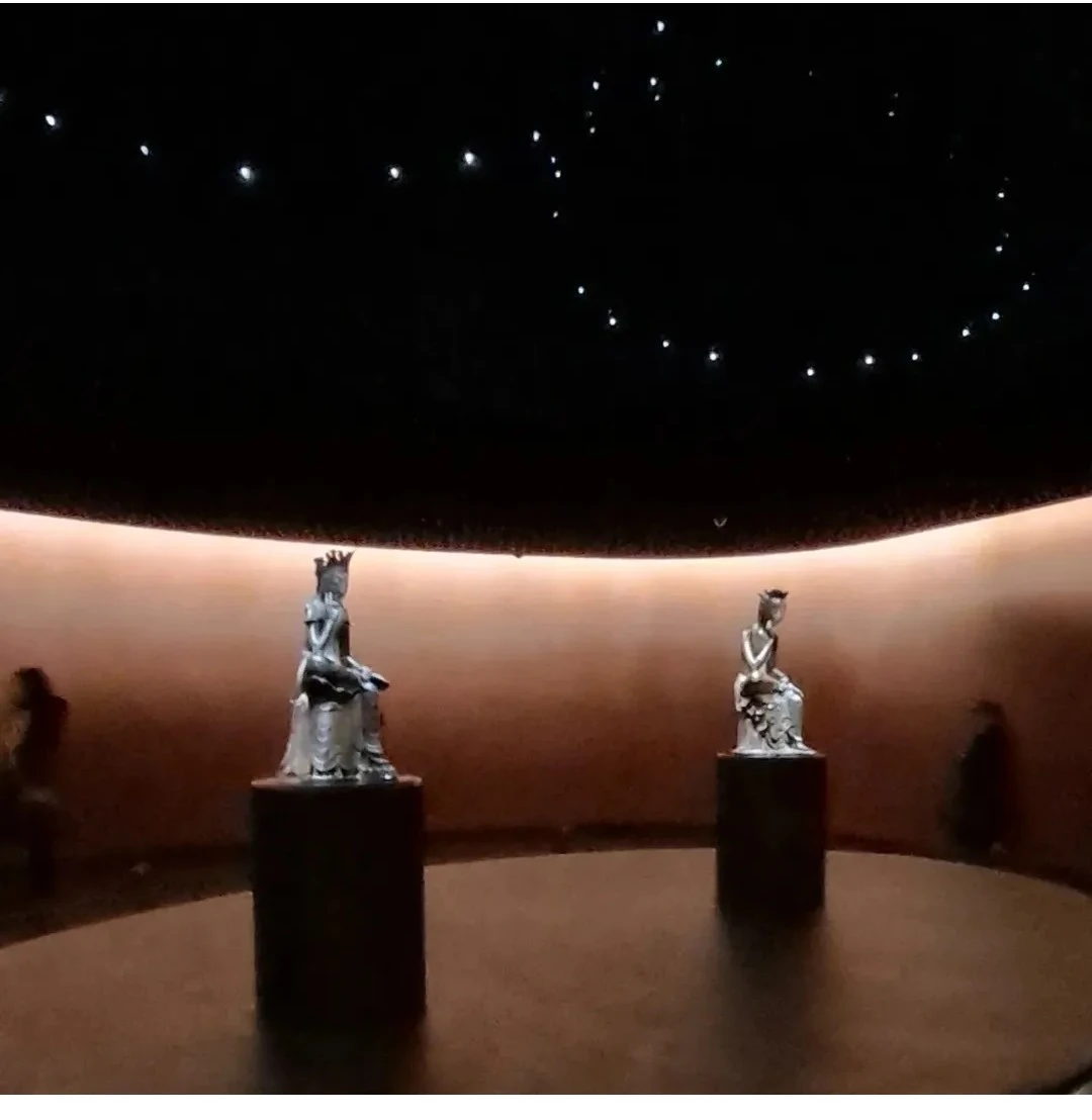 몇 년 전부터 화제를 모으고 있는 '사유의 방'을 먼저 가보았다. 국립중앙박물관이 다시 '힙'해지도록 만든 주역이라고 할 수 있다. 두 개의 국보 반가사유상을 함께 전시해놓은 '사유의 방'은 유물전시로는 센세이셔널한 인기를 끌었던 공간으로, 원오원의 최욱 건축가가 설계한 것으로 알려져 있다. 완전히 어두운 공간 속에서 두 점의 유물에 집중할 수 있도록 조명과 바닥, 벽 등의 요소들이 매우 정교하게 설계되고 만들어졌다. 천장의 조명은 마치 반딧불들이 무수히 떠 다니는 듯한 인상인데, 유물 감상에 방해가 되지 않도록 매우 잔잔하게 처리되어 있다. 벽은 흙 재질로 마감되어 있는데, 수직이 아니라 위로 올라갈수록 바깥쪽으로 기울어져 있다. 바닥은 나무재질로, 입구에서부터 유물을 향해 미세하게 올라가도록 설계되어 있다. 이 모든 게 바깥공간과는 완전히 다른, 고요한 침묵의 공간에서 유물 감상에 집중할 수 있도록 만든 장치라고 생각되었다. 유물 뒤쪽으로도 통로를 내어 후면까지 감상할 수 있도록 한 것도 좋은 시도였다고 생각된다.