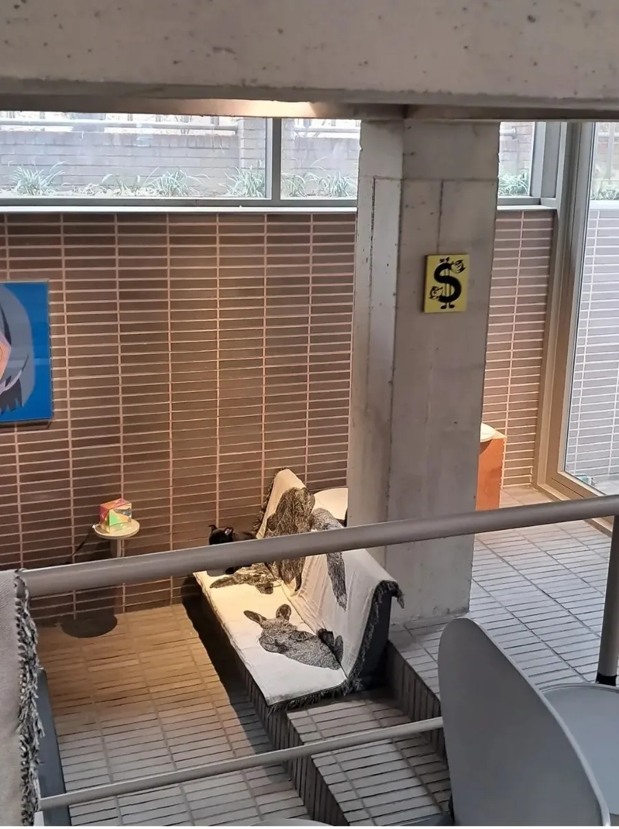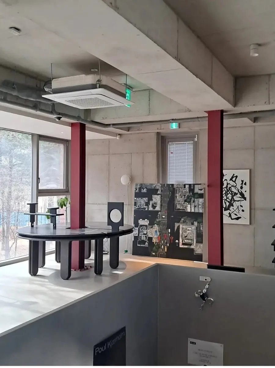 내부 인테리어 역시 노출콘크리트와 타일, 붉은 에이치빔 기둥 등을 활용하여 특유의 분위기를 만들고 있었다. 여기에 감각적인 미술작품들이 더해져 힙한 성수동의 감각과 무척 잘 어울리는 건축물을 완성했다.