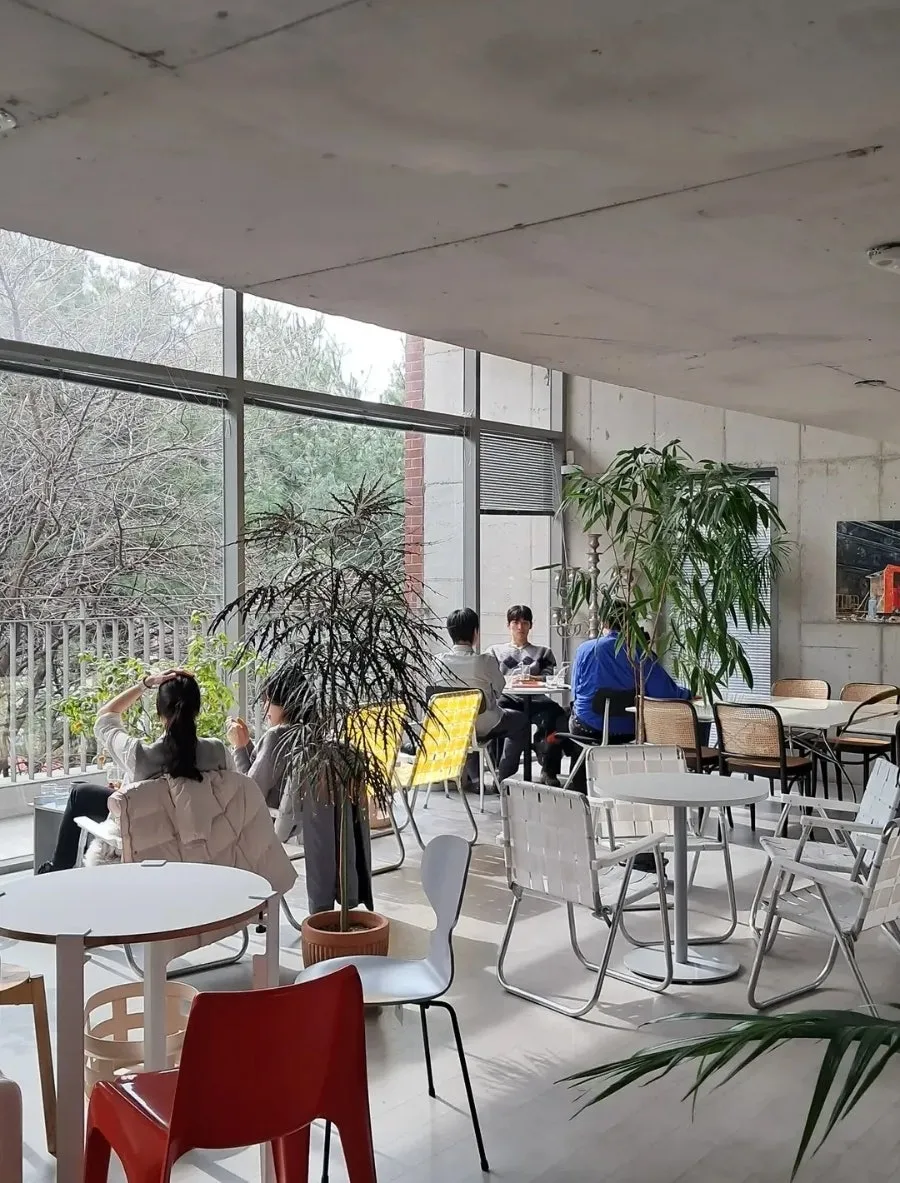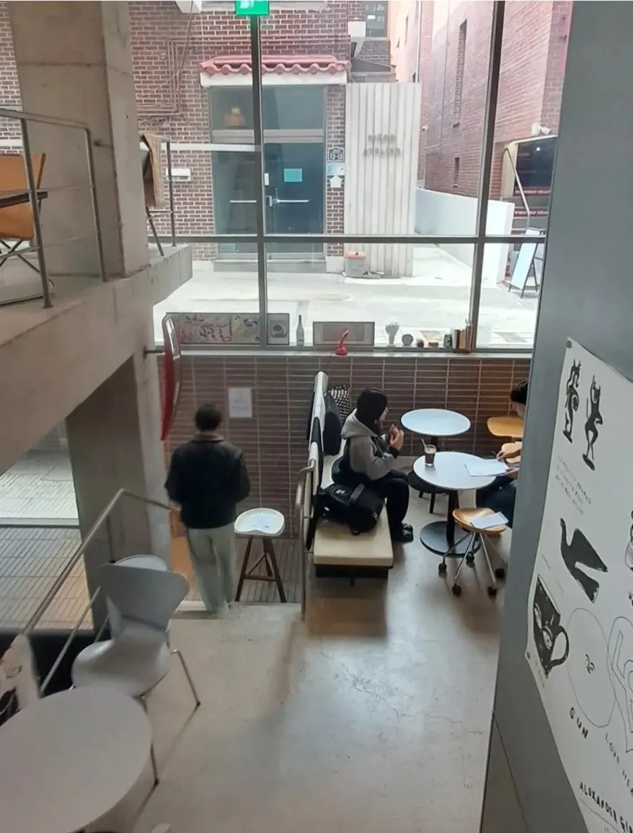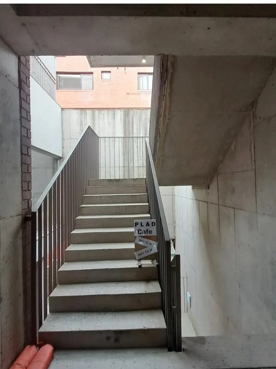 주차장 부근에 있는 약간의 외부공간을 거쳐 내부 카페로 들어가게 되는데, 특이한 것이 출입문을 열자 마자 반지하 느낌으로 계단을 내려가야 한다는 것이었다. 건축가의 설명글을 읽어보니 기존에 공사중이었던 건물을 활용해야 하는 특이한 조건이었다고 한다. 공사중이었던 건물이 지하층까지만 시공되어 있다보니, 그것을 활용한 구조와 공간을 만들게 되었다는 것이다.