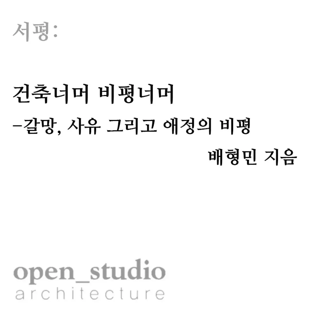 사실 우리나라 건축계에서 본격적인 '비평'이라는 것은 그다지 활성화되어있지 않다. 아니, 거의 존재하지 않는다고 보아도 크게 무리가 없다고 할 수준이다. 그도 그럴 것이, 그저 살아남기에도 각박한 현실 속에서 그 건축작업에 대한 심도깊은 관찰과 분석, 비평을 하고 그것을 받아들일 여유가 없기 때문이다. 그저 자신을 홍보하기 위한 화려한 몸짓과 현란한 사진, 인스타그램과 핀터레스트를 스쳐지나가는 어렴풋한 인상들이 건축계를 지배하고 있다. 존재하지도 않는 건물을 실사와 혼동될 정도의 렌더링으로 뽑아내고, 더욱 나아가 몇 마디 스크립트로 이미지를 만들어내는 AI의 시대이다. 이런 상황에서, 과연 '건축비평'이 할 수 있는 역할이 있을까?