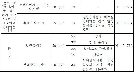 A는 해당 용도의 연면적입니다) 임을 알 수 있고, 일반음식점이나 휴게음식점은 N = 0.175 A 임을