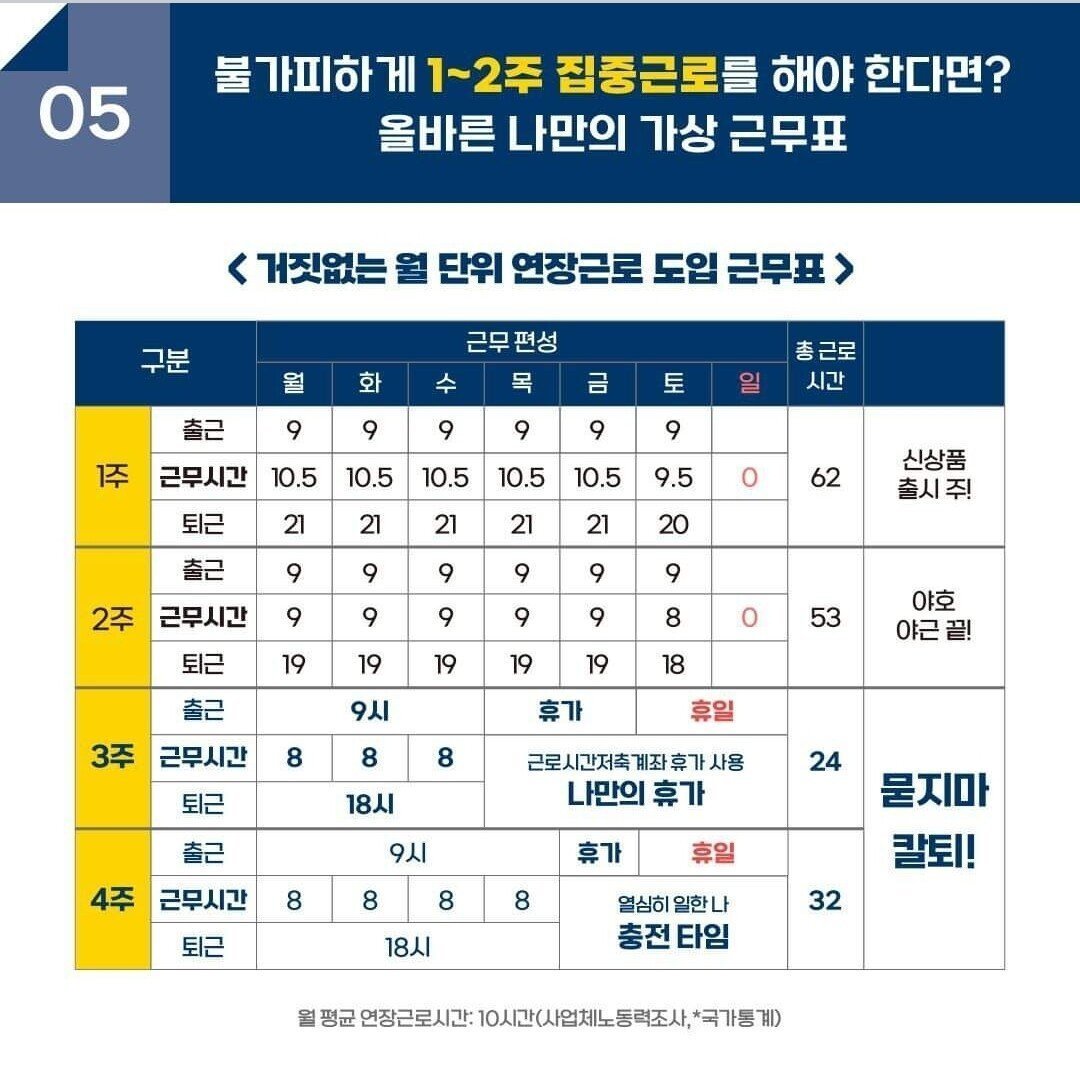 고용노동부에서 제시한 가상 근무표. 1~2주차 때 열심히 달리면 3~4주차 때 휴가가 생긴다.