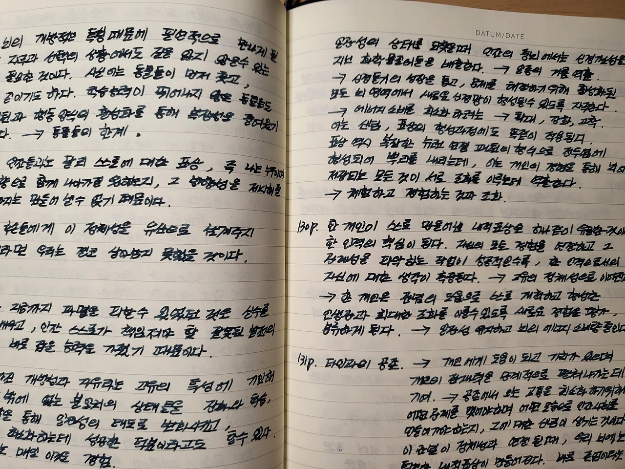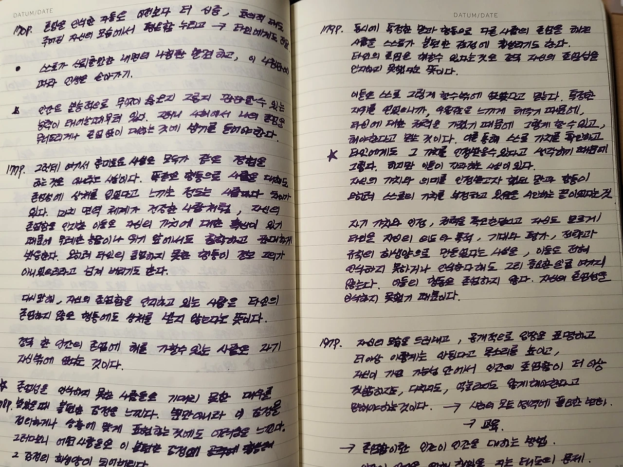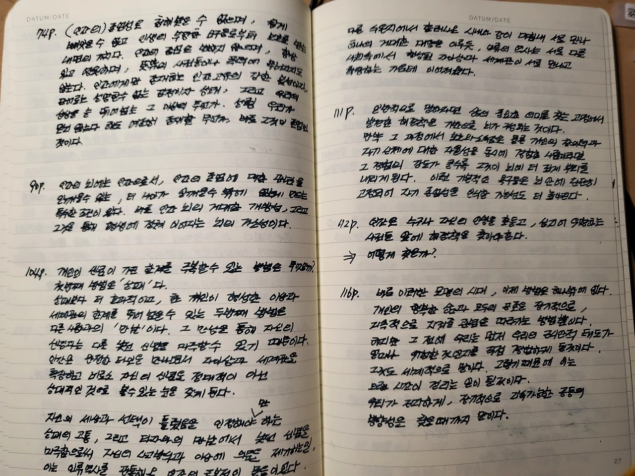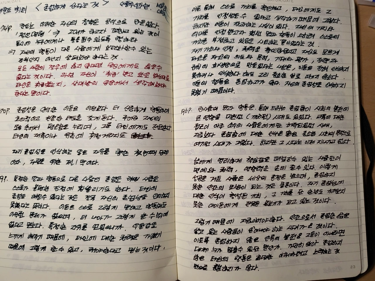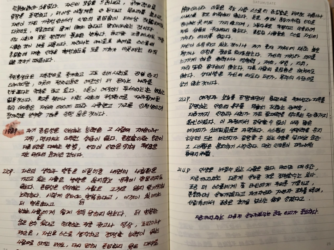 그렇게 만년필로 선명하게 필사된 노트를 바라보며 뒤적거리면 소소한 만족감이 밀려든다. 아쉬움은 중요한 부분은 또 다른 색의 잉크로 충전한 만년필을 사용해 구분을 지어야 하는데 한 가지 만년필을 들고 필사를 시작하면 좀처럼 만년필을 바꿔서 쓰기 귀찮은 점도 있다. 정말 부지런한 사람은 여러 색깔로 구분 지으며 필사를 하기도 한다.