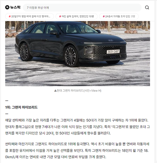 차를 사게 된다면 그랜져를 사야겠다고 생각한 건 운명이었다. 고민할 이유가 없이 돌아다니는 그랜져의 벌집모양에 더 꽂혔다. 그럴 즈음 작년 말에 이런 기사도 보게 되었다. 50대가 가장 선호하는 차 1위에 그랜져가 올라온 것이다. 이제 아이들도 커서 SUV에서 벗어나 퇴직 후까지 바라보며 타기엔 그랜져하이브리드가 딱이었다.