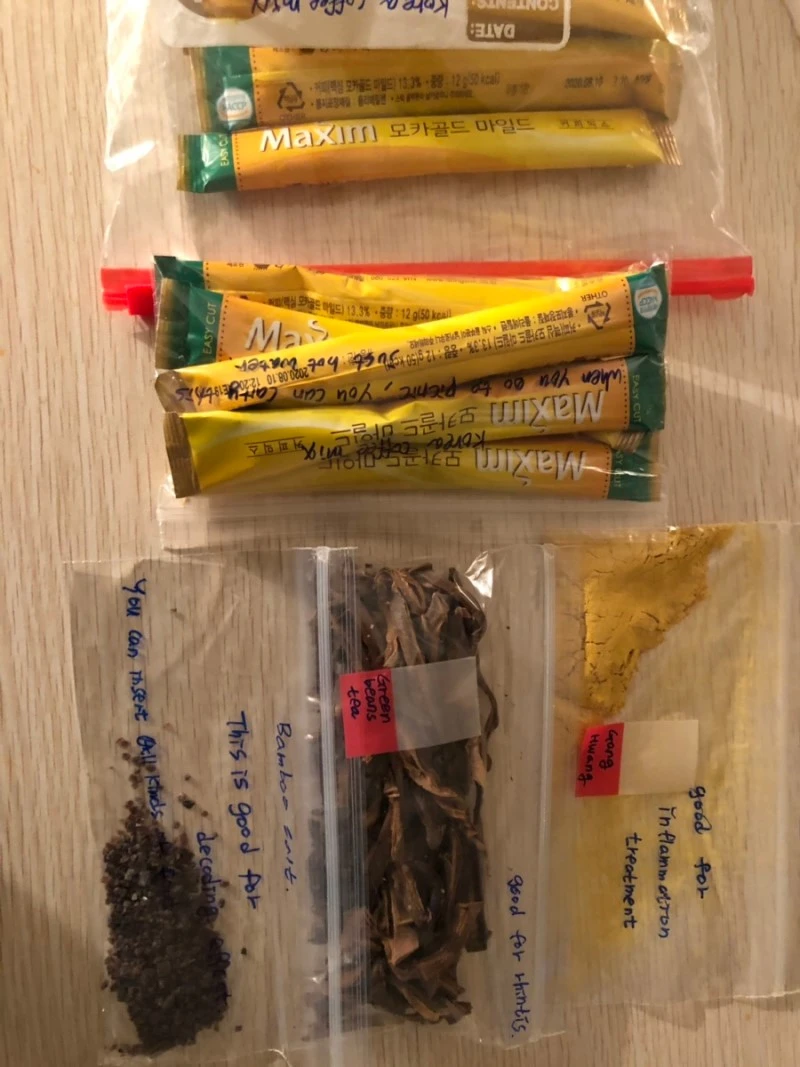 아쉬운 작별의 시간이 다가오자 한국에서 미리 작은 기념품이라고 챙겨 오지 않았던 게 아쉬웠다. 한국의 특색을 나타낼 수 있는 뭔가를 선물로 주면 좋겠다 생각하니 아이디어가 떠올랐다. 수료식 날 브라이언에겐 한국 커피믹스, 제임스에겐 커피믹스, 강황, 죽염, 작두콩차를 지퍼백에 각각 포장해 명칭과 효능을 인터넷을 찾아 매직으로 그 포장지에 적어 드렸더니 예상치 못한 선물에 엄청 좋아했다. 그 용법이나 효능을 서투른 영어로 설명하는 게 즐거웠고 옆에서 다른 교육생은 커피믹스 타 먹는 법을 설명했다. 그건 사실 내가 먹으려고 집에서 주섬주섬 챙겨 온 것이지만 미국 와서는 개봉조차 못했었던 것이다. 특히 건강이 좋지 않은 제임스를 위해 염증 해소에 좋은 강황을 준다는 게 의미가 있다고 생각했다. 제임스는 고맙다며 자기가 못 먹게 되더라도 지인들과 함께 나누면 된다고 했다. 그날 난 한국 강황, 커피믹스, 작두콩차 홍보대사가 되었다. 제임스 또한 서구식 식단보다 동양식에 대해 관심을 가지고 식사도 신경 써서 하는 거 같았다. 지금까지도 제임스의 인스타그램을 통해 그의 일상을 엿보고 있다.