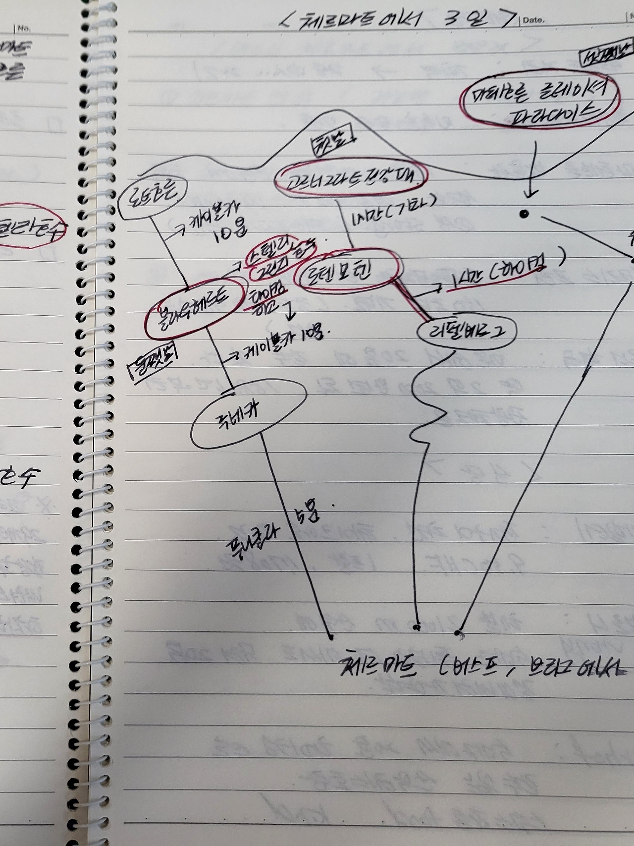 이론은 늘 어렵다. 나이 탓도 있지만 갈수록 기억력이 감퇴하여 책도 한번 읽으면 바로 증발된다. 이제 뭔가 기록하는 건 필수가 되었다. 스위스 여행노트를 작성해서 항공편도 출력해서 붙이고 멘리헨 트래킹 코스도 그림으로 그리고, 체르마트 가서 3대 호수도 정복할 계획인데 그것도 그림으로 그렸지만 정말 가서 몸으로 접하는 게 훨씬 쉽다는 걸 작년에 느꼈다.