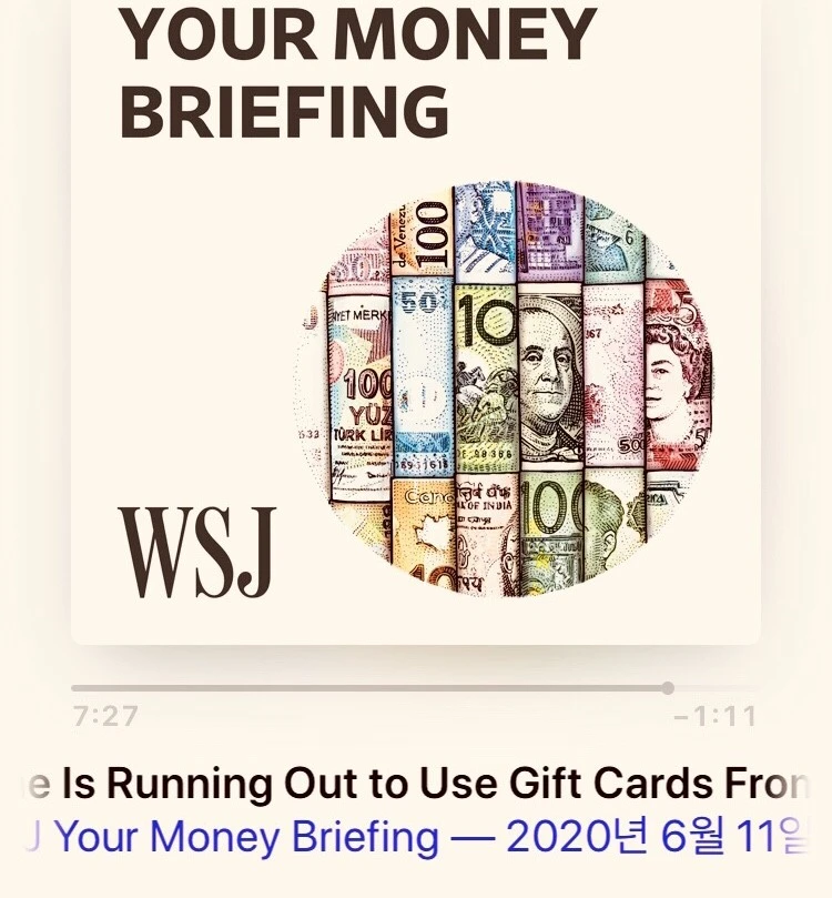 앵커의 빠른 멘트만 있는 팟캐스트만 있는 줄 알았는데 어느 날 월스트리트 저널에서 Your Money Briefing이라는 제목의 팟캐스트를 듣게 되었다. 경제에 대한 이야기를 보통 속도로 차분하게 이야기해준다. 괜찮은 팟캐스트 찾았을 때의 기쁨이란 이루 말할 수 없다. 무료 팟캐스트의 세계는 너무 무궁무진하다. 무엇보다 정신이 흝트러지지 않고 리스닝에 집중하는 것이 중요하다.