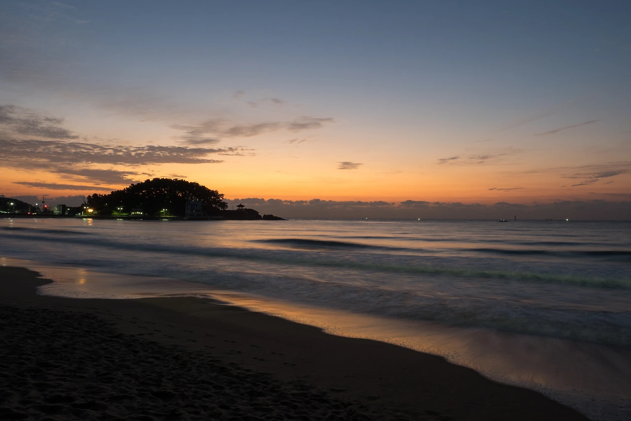 아직 해가 뜨진 않아요. 예정 시각은 6시 23분이었거든요. 삼각대를 설치하고 천천히 기다려봅니다. 일단 장노출이 되는 것을 보니 아주 어두운 시간이었죠. 오징어배는 우리보다 더 부지런했어요. 저 멀리 나가 있잖아요. 아직 일출 해가 어디로 뜰지 몰라요.