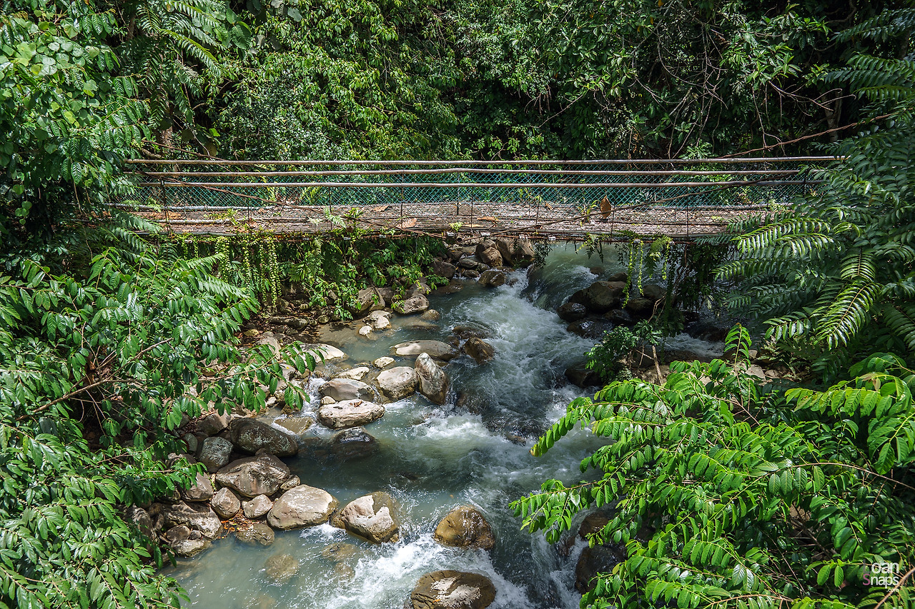 내 티셔츠는 이미 래시가드가 돼버렸고, 내 등에서 흘러내리는 땀을 음료수 병에 담아도 될 정도로 힘들 때쯤 캐노피 다리가 등장했다. 오! 뭔가 흥분된다. 저 다리를 건너간단 말이지? 딱 봐도 위험해 보인다. 줄과 나무로 만든 다리.. 안전장치란 없다. 혹하면 훅간다.